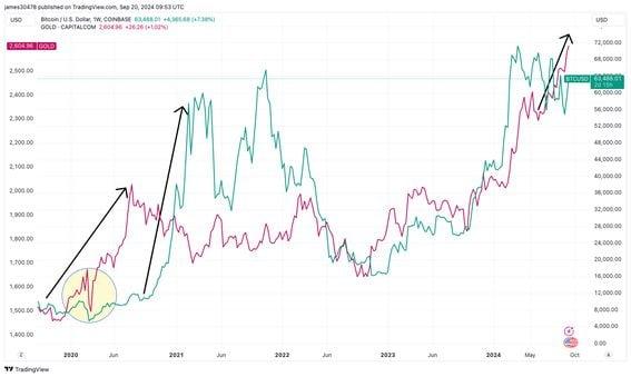 With both assets leading the market, here's a closer look at the factors driving their remarkable performance. Bitcoin has surged 7% in the past five days, breaking through $64,000 for the first time this month. Gold has hit all-time highs, surpassing $2,600 an ounce. These standout performances are linked to increased global liquidity, with expanding global central bank balance sheets and the Federal Reserve's recent rate cut stimulating investment and economic activity. In the past five days, bitcoin (BTC) has surged 7%, breaking through $64,000 for the first time since Aug. 26. Gold, for its part, has reached all-time highs on over 30 occasions this year, topping $2,600 an ounce. These remarkable performances mark the first time since bitcoin's inception in 2009 that both are the top-performing assets of the year, according to Charlie Bilello, the chief market strategist at Creative Planning, an investment management and financial planning firm. Year-to-date, gold has risen 27%, surpassing its 2020 performance of 25%. The last time it did better was 2007. What is driving this impressive rise? Gold has historically been seen as a hedge against monetary debasement and global uncertainty, and current economic conditions suggest it is again fulfilling this role. The recent surge in gold prices can be attributed to these factors. Notably, gold began its rally before the significant monetary debasement triggered by the Covid pandemic in 2020, while bitcoin emerged as a star performer in late 2020 and into 2021. With bitcoin now just 14% away from its all-time high, is it playing catch-up once again? A closer examination reveals that bitcoin's price tends to move in line with the Federal Reserve's net liquidity metric. This measure, calculated by subtracting reverse repo and the Treasury General Account from the Fed's balance sheet, indicates that bitcoin tends to follow liquidity trends. Both bitcoin and net liquidity bottomed out toward the end of 2022, coinciding with the FTX collapse. Since then, bitcoin has steadily risen alongside an increase in net liquidity, which now exceeds $6 trillion. The Federal Reserve's balance sheet is currently at $7.1 trillion, and although it is still engaging in quantitative tightening, the pace has slowed. The collapse of Silicon Valley Bank (SVB) in March 2023 led to a $1.6 trillion reduction in the balance sheet, bringing it back to levels seen during the initial phases of quantitative easing in response to the pandemic. The draining of reverse repo balances, now just over $300 billion, releases liquidity back into the financial system. This is stimulative, increasing the availability of funds for lending, investment, and overall economic activity. Looking more broadly, the combined balance sheets of the world's 15 largest central banks – including the U.S., European Union, Japan and China – approach $31 trillion. While this number alone is not the focus, the trend shows a global resurgence in central bank balance sheets from about $30 trillion in July. This increase in liquidity is particularly stimulative for bitcoin, which tends to mirror liquidity trends. Adding to this, just Wednesday the Fed cut the interest rate by 50 basis points, further supporting the rise of bitcoin and gold. https://www.coindesk.com/markets/2024/09/20/bitcoin-gold-may-be-sensing-monetary-debasement-as-records-beckon/