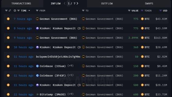 Wallets linked to the German government still hold some 23,788 bitcoin, meaning that it has already sold more than half of its seized assets, according to Arkham Intelligence data. Germany transferred 16,309 bitcoin from its holdings to crypto exchanges and market makers on Monday. The bitcoin price fell to as low as $55,000 before recovering. Bitcoin (BTC) fell on Monday afternoon in Europe as the German government transferred over $900 million worth of assets from its bitcoin holdings, blockchain data shows. According to blockchain data platform Arkham Intelligence, Bitcoin wallets labeled as belonging to the German government moved a total of roughly 16,309 BTC in several batches to external addresses, including to crypto exchanges Bitstamp, Kraken and Coinbase and market makers Flow Traders and Cumberland DRW. Bitcoin's price dropped 3% to as low as $55,000 shortly after the last group of blockchain transactions totalling 8,700 BTC. Later, it rebounded to slightly above $56,000, still down 1.2% over the past 24 hours. The price action came after last week's slide to the lowest price since February. Market observers pointed to a massive supply overhang coming to the market during the relatively quiet and low-volume summer season with the German and U.S. governments apparently selling seized assets just as the defunct crypto exchange Mt. Gox starts to issue repayments. With the latest transfers, the German government is more than halfway through its selling spree, with holdings now reduced to 23,788 BTC worth $1.3 billion from 50,000 BTC since it started unloading tokens last month, according to Arkham data. https://www.coindesk.com/markets/2024/07/08/bitcoin-drops-as-german-government-moves-another-500m-of-assets/