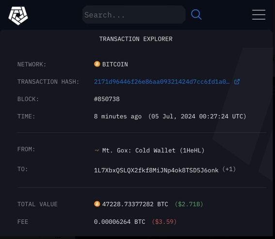 BTC slides to lowest since late February, breaching key price support. BTC slides to its lowest level since late February, breaching key price support. Early Friday, defunct exchange Mt. Gox moved 47,228 to a new address from cold storage. Bitcoin's (BTC) slid for a fourth day as defunct exchange Mt. Gox moved sizeable BTC to a new wallet, potentially preparing for creditor repayments. The leading cryptocurrency by market value fell over 4% to $53,600, the lowest since Feb. 26, according to charting platform TradingView and CoinDesk data. At 00:27 UTC, Mt. Gox transferred 47,228 BTC ($2.6 billion) from cold storage to a new wallet, according to blockchain analytics firm Arkham Intelligence. The exchange is slated to start distributing assets stolen from clients in a 2014 hack. The impending repayments, which include 140,000 BTC ($7.73 billion), 143,000 BCH, and the Japanese yen, were announced last month. Since then, traders have been worried that creditors who have patiently waited for reimbursements for a decade will immediately sell upon receiving coins, creating mass selling pressure in the market. Note that BTC was trading at roughly $600 when the exchange was hacked in 2014, and today, it is worth over $55,000. Several analysts have recently tried to calm nerves by saying the potential selling pressure from reimbursements would be limited, but to no avail. BTC has declined 10% in seven days and 22% in four weeks. The intense sell-off has flipped the horizontal support of $56,500 stemming from May lows into resistance. Besides, the bears have established a foothold below the crucial 200-day SMA and the bull market trendline. https://www.coindesk.com/markets/2024/07/05/bitcoin-dips-below-54k-as-mt-gox-moves-26b-in-btc/