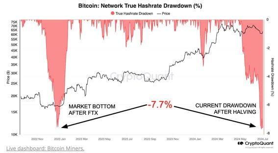 Miner capitulation levels are now comparable with those in end of 2022, which was the market bottom after FTX implosion, CryptoQuant said. Bitcoin miner capitulation metrics are approaching the same level as the market bottom following the FTX crash in late 2022. Daily miner revenue has dropped to $29 million from $79 million following the bitcoin halving earlier this year. The hashrate has slumped by 7.7% since the halving as inefficient miners turn off their equipment. Bitcoin (BTC) miners are showing signs of capitulation, an event that is typically tied to a market bottom after the world's largest cryptocurrency endured a 13% plight over the past 30 days. Bitcoin is currently trading at $60,300 after sliding by 3% on Wednesday. This level has acted as a critical support since April, with bitcoin bouncing three times from this region before heading back towards the $70,000 mark. Data provider CryptoQuant believes this is likely to happen again in the near future as numerous signs point towards capitulation following a period of intense sell pressure. Two signs of miner capitulation are dwindling hashrate and mining revenue by hash (hashprice), both of which are down significantly this month, with hash rate plunging by 7.7% since the halving at hashprice nearing all-time lows. Hashrate is the mining power in the Bitcoin network, and hash price refers to the revenue miners earn from a unit of hashrate. Miners are also experiencing a hit to their daily revenue, which fell to $29 million today from $79 million on March 6. This has led to miners turning off equipment and the subsequent drop in hashrate. "Miners have been hit by a 63% decline in daily revenues due to the halving and the collapse of transaction fees to 3.2% of total revenue," CryptoQuant said in a report. Miner capitulation levels are now comparable with those in December 2022, which was the market bottom following the demise of FTX. https://www.coindesk.com/business/2024/07/03/bitcoin-bottom-is-near-as-miners-capitulating-near-ftx-implosion-level-cryptoquant/