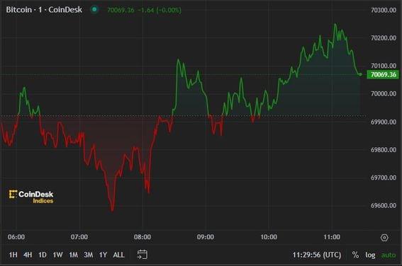 The latest price moves in crypto markets in context for May 22, 2024. Latest Prices Top Stories Bitcoin hovered around the $70,000 mark during the European morning, a slight drop following Tuesday's rally to as high as $71,400. BTC is currently priced at $70,069, around 1.6% lower over 24 hours. The CoinDesk 20 Index (CD20), offering a measurement of the broader digital asset market, fell about 0.5%. BlackRock's spot bitcoin ETF (IBIT) recorded over $290 million in inflows on Tuesday, its highest one-day figure since April 5 and nearly three times the previous high this month: $93 million on May 16. As a whole, ETFs took on nearly $300 million in net inflows on Tuesday. Ether's market cap rose by over $70 billion on Tuesday, not far off the entire market value of Solana's sol token at around $80 billion. The ether price surged more than 19% on Monday for a total of $439 billion, according to data source TradingView. The surge followed renewed hopes that a spot ether ETF will be approved in the U.S. Analysts say the gap between ether and rivals like SOL will widen in the coming months as a potential spot ETF launch opens the token to mainstream institutional adoption. At the time of writing, ETH is priced at $3,726, a decrease of just over 0.8% in the last 24 hours. WisdomTree has been given the green light to list bitcoin and ether ETPs on the London Stock Exchange. The asset manager said it was among the first applicants to have its prospectus given the go-ahead by the FCA. The Physical Bitcoin (BTCW) and Physical Ethereum (ETHW) ETPs are expected to start trading on May 28 and will be available only to professional investors. They will carry fees of 35 basis points. The FCA said in March it would not object to requests from financial institutions seeking to list ETPs for professional investors, a partial lift on the ban it put in place in 2020. The products however remain out of bounds for retail investors. Chart of the Day The chart shows the share of BTC/USDT trading that occurred during the U.S. hours (13:00 to 20:00 UTC) in the first four months of the year, starting from 2015. The U.S. share has steadily increased, reaching a record high of 46% in 2024 as the debut of spot ETFs in the U.S. opened the doors to mainstream institutional adoption. "The new ETFs calculate their net asset value (NAV) against dedicated benchmarks at the US close each weekday, thereby boosting arbitrage and price discovery," Paris-based Kaiko said in the weekly newsletter, explaining the concentration of activity during the American hours. Source: Kaiko - Omkar Godbole Trending Posts SEC's Gensler Says House Bill Would 'Undermine' Regulator's Crypto, Capital Markets Oversight Coinbase, Kraken, Others Form Coalition to Tackle 'Pig Butchering' Scams Donald Trump-Themed Meme Coins Breed Crypto Millionaires as MAGA Token Surged https://www.coindesk.com/markets/2024/05/22/first-mover-americas-bitcoin-hovers-around-70k-after-etf-records-month-high-inflows/