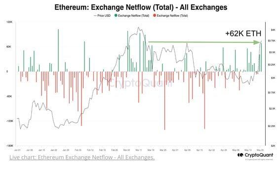 The surge in deposits comes after a 22% rally in ether spurred by hopes of a spot ETF approval. Exchanges experienced a net inflow of 62,000 ETH ($231 million) this week, suggesting a period of volatility is coming. Daily spot buying from ETH permanent holders hit its highest level in 2024 this week. A significant price correction is expected if a spot ether ETF is delayed or denied due to high levels of open interest. Ether (ETH) is expected to experience a period of volatility this week due to exchange inflows spiking to the highest level since March, according to a report by data provider CryptoQuant. The daily net flow of ETH, which tracks inflows and outflows to exchanges, hit 62,000 ether ($231 million) this week. High exchange flows are typically associated with volatility, the report said. The surge in deposits comes on the back of a significant rally in ether, with prices rising by 22% in two days after Bloomberg analyst James Seyffart said that the odds of spot ether exchange traded-fund (ETF) approval have increased to 75% and multiple reports that filing process with the U.S. Securities and Exchange Commission (SEC), for the ETFs, are suddenly seeing progress. Traders responded by aggressively opening ETH long positions on perpetual exchanges and buying spot, resulting in the largest daily spot buying from ETH permanent holders so far in 2024. These trades were placed in the hopes that ETH price will see a similar uptick that bitcoin (BTC) has seen since the news of the approval of U.S. spot ETFs started to make the rounds last year. The increase in demand for ETH led to a short squeeze, with 9,300 ETH being liquidated on the short side over a 48-hour period. CryptoQuant warns that if an ether ETF application is delayed or denied, a significant price reaction could occur due to high open interest, which currently stands at a record high of $11.7 billion. https://www.coindesk.com/business/2024/05/22/ether-volatility-expected-as-traders-flood-exchanges-with-231m-of-eth-amid-etf-hopes/