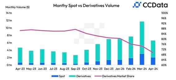 Bitcoin, the leading cryptocurrency by market value, fell nearly 15% in April, ending a seven-month streak. Cumulative monthly spot and derivatives trading volume tanked by 43.8%, CCData said. Binance’s spot market volume registered its first decline since September 2023. Cryptocurrency trading volume cooled in April, registering the first decline in seven months as escalating geopolitical tensions and slower inflows into U.S.-listed spot ETFs weighed over the digital assets market. The cumulative volume in spot and derivatives markets fell by 43.8% to $6.58 trillion, a sharp retracement from March’s record high of $9.12 trillion, according to a report by London-based digital assets data provider CCData. Derivatives fell out of investor favor again as activity in the futures and options market declined by 47.6% to $4.57 trillion. Meanwhile, the spot market volume suffered a relatively measured drop of 32.6% to $2.01 trillion. “This decline followed unexpected macroeconomic data, an escalation in the geopolitical crisis in the Middle East, and negative net flows from U.S. spot bitcoin ETFs, leading to major crypto assets retracing the gains they made in March,” CCData said in a report shared with CoinDesk. Bitcoin (BTC), the leading cryptocurrency by market value, fell nearly 15% to under $60,000 last month, snapping a seven-month winning trend. The sell-off came as an overheated bull market ran into broad-based risk aversion characterized by renewed tensions in the Middle East, dwindling probability of rapid Fed rate cuts this year and strength in the dollar index. The CoinDesk 20 Index, a measure of the most liquid digital assets, traded nearly 20%, and the total crypto market capitalization slipped by 16.8% to $2.177 trillion. While Binance remained the largest crypto exchange by volume, its combined spot and derivatives market share fell to 41.5%. The exchange’s spot market trading volume tanked 39.2% to $679 billion in April, recording the first decline since September 2023. “The decline in Binance’s market share also coincided with the news that its founder and previous CEO, Changpeng Zhao, was sentenced to four months in prison for the violation of U.S. money laundering laws,” CCData noted. Binance CEO Changpeng “CZ" Zhao stepped down after pleading guilty to U.S. criminal charges in November and was replaced by Richard Teng. Since then, Binance’s spot market share has increased from 30.8% to 33.8%, CCData said. https://www.coindesk.com/markets/2024/05/09/crypto-monthly-trading-volume-drops-for-first-time-in-seven-months-to-658t/