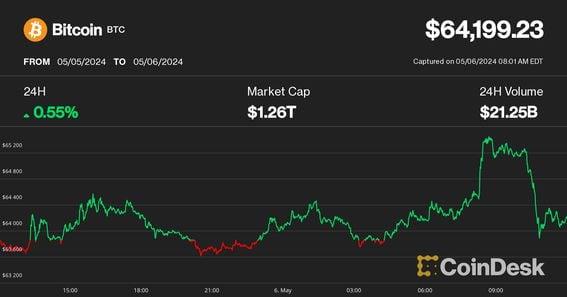 The latest price moves in crypto markets in context for May 6, 2024. Latest Prices Top Stories Bitcoin trades around $64,000 early Monday as the crypto market erased last week's losses. BTC surged to $65,400 during Asia trading hours Monday, its highest price in almost two weeks, and now is up almost 15% from last week's corrective bottom. Bitcoin's swift recovery to a bullish weekly close "sets up the possibility the next higher low is already in place ahead of the next major upside extension to a fresh record high," LMAX Group market strategist Joel Kruger said in a Monday report Alternative cryptocurrencies (altcoins) followed suit, with SOL, AVAX and NEAR advancing 4%-5% over the past 24 hours. The broader crypto market is up 3.2% in the past 24 hours as measured by the CoinDesk 20 Index (CD20). Grayscale's bitcoin ETF saw its first daily inflow after bleeding billions of assets. The Grayscale Bitcoin Trust (GBTC), the largest bitcoin ETF by assets, saw a $63 million of fresh funds from investors on Friday, ending an almost 4-month streak of daily outflows since its conversion to a spot ETF structure in January, data compiled by Farside Investors shows. U.S.-listed spot ETFs also had their best day in more than a week, attracting $368 million of inflows, showcasing a positive sentiment turnaround with bitcoin's rebound. Bitfinex security breach dismissed by CTO Paolo Ardoino as "fake." Controversy arose over the weekend after a hacker group leaked a database of alleged usernames and passwords of over 22,000 Bitfinex exchange users. However, Ardoino refuted the claims and pointed out discrepancies, saying that the company does not store 2-factor authentication data as "clear texts" and the information was likely recycled from previous data thefts unrelated to Bitfinex. Trending Posts Australian Court Hands Win to Market Regulator in Case Against Qoin Blockchain, But There is a Catch BTC-e Operator Alexander Vinnik Pleads Guilty to Money Laundering Conspiracy Charge Former Cred Executives Indicted on Wire Fraud, Other Charges https://www.coindesk.com/markets/2024/05/06/first-mover-americas-bitcoin-nears-65000-amid-strong-crypto-rebound/