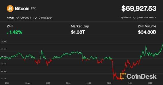 Major U.S. equity indices closed the day lower after disappointing CPI numbers, while BTC was up 1%. Bitcoin (BTC) climbed back to $70,000 Wednesday, reversing its knee-jerk dip following hotter-than-anticipated U.S. inflation data for March. BTC slipped nearly 4% to $67,500 during early U.S. hours after a government report showed the Consumer Price Index (CPI) rising faster than analyst expectations, prompting investors to temper their expectations for rate cuts this year. The dip echoed through multiple asset classes, but bitcoin gradually erased all its losses, and was up over 1% over the past 24 hours, outperforming U.S. equities and gold, both of which finished with sizable declines for the day. At press time, bitcoin had slipped a bit from the $70,000 level, trading at $69,800. Most cryptocurrencies lagged behind BTC, with the broad-market CoinDesk 20 Index down 0.6% during the same period, dragged lower by a 5%-7% decline in major altcoins polkadot (DOT), bitcoin cash (BCH), near (NEAR) and aptos (APT). Decentralized exchange Uniswap's governance token (UNI) plummeted more than 10% as it received an enforcement notice from the U.S. Securities and Exchange Commission, foreshadowing regulatory actions against the platform. Digital asset hedge fund QCP Capital said the rebound showcased the underlying demand for bitcoin, with investors seeing dips as a buying opportunity. "This bounce is not surprising as the desk continues to see strong demand for long-dated BTC calls even on this dip," QCP said in a Telegram update. "It is indicative of deep structural bullishness in BTC." Will Clemente, co-founder of Reflexivity Research, noted in an X post that the ever-increasing U.S. debt levels are more important for the big picture than individual CPI readings, and the most likely scenario is that policymakers will let inflation run higher than the 2% target to help inflate the debt. "Bitcoin is an insurance against this," Clemente added. https://www.coindesk.com/markets/2024/04/10/bitcoin-rebounds-to-70k-shrugging-off-hot-us-inflation-print/
