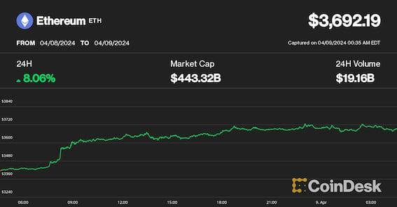 Liquid staking tokens like Lido, Rocket Pool, and ether.fi follow ether's gains. Ether rallied in the early morning of East Asia's trading day, outperforming the CoinDesk 20 Index. Ether's performance seems to be based on market interest in new DeFi protocol Ethena, versus an anticipation of a spot ether ETF approval Ether (ETH) prices rallied during the early hours of the East Asia trading day while Bitcoin (BTC) remained relatively stable. According to CoinDesk Indicies data, ether prices rose to $3600, while bitcoin was in stasis around $71,000. The CoinDesk 20, a measure of the world's most liquid digital assets, was up 3.5% and trading above 2,600. Decentralized liquid staking protocols like Lido DAO and Rocket Pool ETH also saw their tokens push well into the green, up 10% and 8%, respectively, according to CoinGecko data. ETH's bitcoin-bearing performance could be attributed to continued market interest in decentralized finance (DeFi) protocol Ethena, which has seen its total value locked (TVL) cross the $2.2 billion mark over the last few days after crossing $2 billion on April 6. Ethena's USDe synthetic stablecoin recently added bitcoin as collateral, CoinDesk reported. This may be purely a rally based on token demand rather than the hope of an ether spot exchange-traded fund being approved in the near future. Bettors on Polymarket see a 16% chance of a spot ether ETF being approved in the U.S. by the end of May and only a 45% chance of it being approved by the end of June. Some traders were positioned for bitcoin leadership after the ether-bitcoin ratio dipped below key support last week. As such, ETH's market-beating rise has brought rapid adjustment in market positioning, leading to a sharp uptick in the perpetual funding rates or cost of holding long/short positions, Singapore-based QCP capital explained in a note on Telegram. The upside volatility has also led to a significant short covering in ETH front-end call options. "Last Friday, we speculated a possible leg higher, and we expected the move to be led by BTC," QCP wrote. "We were wrong about the leader, as this move has been very much led by ETH." https://www.coindesk.com/markets/2024/04/09/ether-rallies-to-36k-as-bitcoin-holds-steady-at-71k/