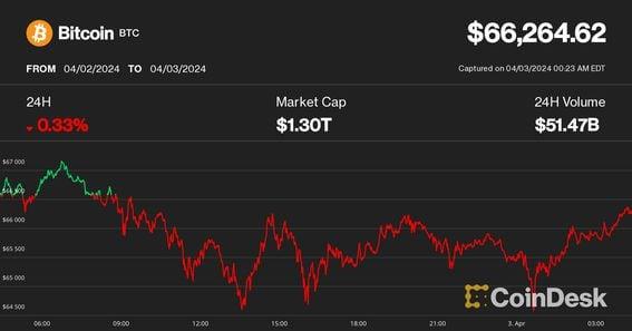 Prediction markets and CME's Fed Watch Tool have virtually ruled out a rate cut until later this year Bitcoin hovers near $66,000, with the CoinDesk20 Index signaling broader market weakness. Crypto futures rates and open interest have decreased, signaling a potential end to a two-month rally. Bitcoin (BTC) held on to losses during the Asian trading hours on Tuesday, trading at around $66,000, as traders digested resurgent Treasury yields and the possibility that the Fed might delay rate cuts until later this year. At the time of writing, ether (ETH) changed hands above $3,300, while the CoinDesk 20 (CD20) was down 0.6% to 2,532. The yield on the 10-year Treasury note clocked a two-week high of 4.40% overnight due to persistent inflation and unexpectedly strong manufacturing activity. An uptick in the so-called risk-free rate typically spurs an outflow of money from risk assets and zero-yielding investments like gold. The yellow metal, however, remained resilient amid the weak tone in bitcoin and Wall Street’s tech-heavy index, Nasdaq. “Bitcoin retraced down to $65,000, mostly attributed to the recent macro outlook on interest rates and rising Treasury yields,” Semir Gabeljic, director of capital formation at Pythagoras Investments, said in an email interview. “Higher interest rate environments typically tend to reduce investor appetite to risk.” On Polymarket, bettors have ruled out a rate cut by May and are split 50-50 on whether one will happen in June. Most of the certain money is on it happening in the fall. The CME Fed Watch tool has a 97% chance of rates staying the same after May’s meeting. Coinglass data shows that over $245 million in long positions have been liquidated in the last 24 hours, with $60 million in BTC positions getting rekt. “Perpetual futures funding rates for most crypto assets are back to 1bps, and global futures open interest decreased by 10 percent overnight, indicating some leveraged long positions are closed,” Jun-Young Heo, a Derivatives Trader at Singapore-baed Presto, added. “As recent bitcoin ETF inflows are stagnating and BTC and ETH market prices came below the 20-day moving average, some trend followers would have regarded yesterday’s downturn as the end of a two-month-long rally,” he continued. https://www.coindesk.com/markets/2024/04/03/btc-back-down-to-66k-as-rising-treasury-yields-catch-investor-interest/