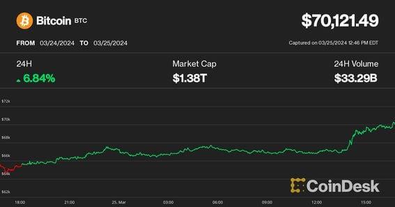 The gains were broad-based, with SOL and AVAX advancing more than 10% over the past 24 hours. Bitcoin took out the $70,000 level after a 10-day cool-off. The rally didn't trigger mass short liquidations, suggesting there weren't many market participants using leverage to bet on falling prices. Bitcoin could reach $83,000 after breaking upwards from its consolidation pattern, 10x Research said. Cryptocurrencies started the week with a strong rally, bouncing back from recent losses as bitcoin (BTC) once again traded above its 2021 peak. Bitcoin (BTC) surged past $70,000 on Monday during U.S. trading hours, surpassing the level for the first time in 10 days and gaining more than 7% over the past 24 hours. Ethereum's ether (ETH) was up 6% during the same period, while tokens for major layer-1 blockchains Solana (SOL) and Avalanche (AVAX) advanced more than 10%. The rally extended to virtually all digital assets, with all constituents of the broad-market CoinDesk 20 Index (CD20) being in the green and the gauge up 6.1% for the day. The sudden resurgence liquidated $195 million of leveraged derivatives positions across all crypto assets, some $129 million of them being short positions seeking to profit from lower prices, CoinGlass data shows. Bitcoin short liquidations reached $53 million, less than the average daily figure of the recent period. The relatively modest amount of short liquidations despite the price surge suggests there weren't many market participants using leverage to bet on continued weakness. Bitcoin targets $83,000 and higher after breaking out from consolidation pattern Monday's surge signaled a potential end of the recent correction for crypto markets, which saw BTC drop below $61,000 last week from record prices above $73,000, coupled with tepid inflows to new U.S.-listed spot bitcoin ETFs and increased selling of Grayscale's GBTC fund. Bitcoin could target new all-time highs after breaking out to the upside from its consolidation pattern, analytics firm 10x Research said in a Monday report. Based on a symmetrical triangle formation, a chart pattern in technical analysis, the breakout could foreshadow a $15,000 to $20,000 price increase for bitcoin's next move from around the $63,000 level, the report said. That would drive BTC as high as $83,000. Another critical level that BTC cleared today was the 2021 peak at $68,000, given that when previous market cycle tops were "retested and broken once more, BTC has tended to put in significant rallies," said Markus Thielen, founder of 10x. The uptrend is supported by several central banks tilting toward dovish stances, which should benefit bitcoin, the report said. "The Fed signaled that they are willing to accept higher inflation for longer and are eager to slow down quantitative tightening," Thielen said. "The Bank of Japan and the Swiss National Bank also surprised on the dovish side." The report highlighted that bitcoin tends to perform well during U.S. election years – and 2024 is one – historically advancing 100%-200%, which also supports the case for higher prices later this year. "Our upside targets of $83,000 and $102,000 could slowly be at play," Thielen said. Updated (15:45 UTC, 3/25/24): Notes price moving past $70K. https://www.coindesk.com/markets/2024/03/25/bitcoin-pumps-above-69k-as-crypto-rally-resumes/