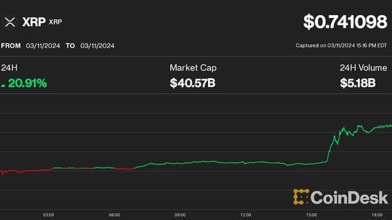 The action could be a sign of traders rotating some of their capital to tokens that haven't moved yet. Ripple (XRP), the native cryptocurrency of the XRP Ledger payment network developed by Ripple Labs, advanced over 20% Monday, snapping its downtrend versus bitcoin (BTC) as the crypto rally broadened. CoinDesk data shows that XRP sharply jumped to $0.74 in a little more than an hour Monday afternoon UTC time, notching its highest price since a very short-lived spike last November amid speculation about a potential BlackRock-managed XRP ETF. Today's 20% gain made XRP the best-performing asset in the broad-market CoinDesk 20 Index (CD20), which was higher by 5%. While bitcoin had already broken record highs and some corners of the crypto space such as meme coins and artificial-intelligence (AI) tokens experienced exorbitant gains, XRP had so far been notably absent from the action. When measured against bitcoin, XRP prior to today's move had slid to a 3-year low, TradingView data shows. Even with this afternoon's big jump, XRP is now only up 17% year-to-date, substantially underperforming BTC's 64% advance and the broad-market CoinDesk 20 Index 54% gain. XRP's rally could be a sign of traders turning their attention and rotating some of their capital to tokens that haven't moved yet as the rally on digital asset markets broadens. Other older cryptocurrencies such as litecoin (LTC) and dash (DASH), which too had been laggards over the past months, also surged over the past 24 hours, gaining 18% and 9%, respectively. Avalanche's AVAX, Polkadot's DOT and Cardano's ADA, advanced 8-13% during the day. XRP transfers from Binance While there wasn't any apparent catalyst immediately before XRP's price action, large token movements from crypto exchange Binance sparked speculations among crypto observers. Blockchain data tracker Whale Alert noted a transfer of 300 million XRP – worth some $187 million at the time – leaving Binance's address and deposited into an unknown wallet. The transfer was then followed by a series of similar outbound transactions – worth 18-19 million XRP each – from Binance and deposited to different addresses. The transactions could perhaps indicate whales – large crypto investors – accumulating XRP before the move up, but may also be due to the exchange shifting coins to new addresses as part of an internal wallet maintenance. https://www.coindesk.com/markets/2024/03/11/xrp-jumps-20-after-mysterious-binance-transfers-as-crypto-rally-expands-to-laggards/