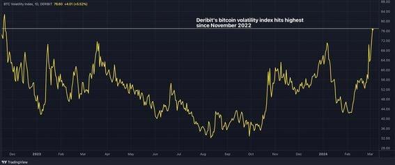 The surging implied volatility has boosted the allure of "call overwriting" strategies that allow investors to generate additional yield on top of their spot market holdings. Deribit DVOL index, a measure of expected price volatility over the next 30 days, has surged to an annualized 76%, the highest since November 2022. The surging volatility has some traders “overwriting calls” to generate additional income. Deribit registers decent trading activity in bitcoin calls at strikes as high as $200,000. Crypto exchange Deribit’s bitcoin volatility index, DVOL, a measure of how much market participants believe prices will move over the next 30 days, has surged. The jump is good news for bitcoin (BTC) holders looking to generate additional income from the options market. The 30-day implied volatility index has risen from an annualized 41% to 76% in one month, reaching the highest since November 2022, per charting platform TradingView. A rise in implied volatility positively impacts the prices of options or derivative contracts that give the purchaser the right to buy or sell the underlying asset later. A call gives the right to buy, while a put confers the right to sell. The greater the volatility, the higher the option premium. Thus, elevated implied volatility often has savvy investors “overwrite” or sell call options to generate additional income on top of their spot market holdings. It is one of the most popular strategies in the stock market. The calls are usually sold at levels higher than the underlying asset’s going market rate. The money received as compensation for selling a call or insurance against price rallies is retained if the underlying asset never rises above the strike level at which the call has been sold. The premium represents the additional yield on top of the spot market investment. If the underlying asset’s price exceeds the strike price, the investor must sell the stock while still pocketing the premium received for selling the call. (Traders with no spot market holdings can sell calls, too, but that’s a risky strategy with limited gain and scope for a considerable loss.) The latest surge in the DVOL seems to have revived interest in overwriting calls. Earlier on Tuesday, someone sold 250 contracts of $75,000 call options expiring in December, according to Deribit’s Asia business development personnel Lin Chen. The seller received a premium of $4.258 million. On Deribit, one options contract represents 1 BTC. “The seller probably has a large stock of BTC in hand and can directly lock in the profit from the selling price of $75,000,” Chen explained. Overall activity on Deribit, which accounts for 85% of the global crypto options market, has picked up, with bitcoin surging 58% this year to trade within striking distance from its record highs near $69,000. The combined notional open interest in crypto futures and options segments has surged to a record high of $32 billion, according to data tracked by Laevitas. The options segment accounts for nearly $30 billion of the total tally. Recently, the exchange has seen decent trading activity in calls at strikes as high as $200,000. Some experts foresee bitcoin’s ongoing bullish trend to peak at around $200,000 by September 2024. “High strikes are being requested for longer expiries but even for March. There is decent trading in the $200,000 calls in June, Sep and Dec expiries,” Luuk Strijers, chief commercial officer at Deribit, told CoinDesk. “The ETF-triggered hype is no longer just about BTC passing $100,000, but now even $200,000,” Strijers said. https://www.coindesk.com/markets/2024/03/05/deribits-bitcoin-volatility-index-signals-further-rally-hits-16-month-high/