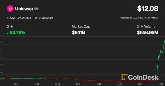 The upgrade would reward UNI token holders who staked and delegated their tokens, according to the proposal. Uniswap's governance token UNI gained 60% after a proposal by a key Uniswap Foundation leader to overhaul the protocol's decision-making. The proposal would distribute protocol fees among UNI holders who stake and delegate tokens to rejuvenate the protocol's decision-making. Decentralized exchange Uniswap's governance token (UNI) jumped Friday as much as 60% after a proposal to overhaul the protocol's governance system, submitted by Uniswap Foundation's governance lead, Erin Koen. The proposal aims to "strengthen and invigorate" Uniswap's governance, and also would reward UNI token holders who staked and delegated their tokens. "I believe we should upgrade the protocol so that its fee mechanism rewards UNI token holders that have staked and delegated their tokens," Erin Koen wrote in an X post. Koen's proposal is a significant development for the largest decentralized exchange by trading volume, marking a departure from last year's initiative to reward token holders with accrued fees. Last June, the Uniswap community turned down a proposal that would have switched on fees for many of the exchange's liquidity pools and distributed a part of the revenue among token holders. In an October move, the exchange started to charge a 0.15% fee on crypto swaps involving ETH, USDC and other tokens initiated on the protocol's interface. Should Friday's overhaul proposal approved in a community vote, it would enable the permissionless and programmatic collection of protocol fees, and distribute them pro-rata to UNI token holders who have staked and delegated their votes. UNI was recently changing hands at $12, up nearly 60% over the past 24 hours and reaching its highest price since April 2022. It vastly outperformed the mostly flat price action of bitcoin (BTC) and the broad-market CoinDesk 20 Index (CD20). https://www.coindesk.com/markets/2024/02/23/uniswaps-uni-jumps-50-on-proposal-to-upgrade-governance/