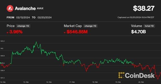 In crypto, large unlocking events usually lead to price declines as the increase in the token's supply outpaces investor demand, a previous study shows. Avalanche's native token AVAX underperformed the crypto market over the past week ahead of its token unlocking event, CoinDesk data shows. Some $365 million worth of locked-up tokens will be released Thursday from vesting and will be added to circulation, according to Token.Unlocks data. The native cryptocurrency of the Avalanche (AVAX) network underperformed most digital assets as the token undergoes a $365 million unlocking event this week that will increase the token's supply. AVAX dipped more than 3% over the past week, while most cryptocurrencies – 148 of the 173 constituents of the broad-market CoinDesk Market Index (CMI) – gained in price. The CoinDesk20 Index (CD20), which tracks the performance of the largest and most liquid crypto assets, advanced 6% during the same period. At press time, AVAX changed hands at $38, some 23% lower than its December high. The underperformance happened as some 9.5 million of previously locked-up AVAX tokens, worth $365 million, will be released on Thursday, increasing the asset's circulating supply by roughly 2.6%, according to data from Token.Unlocks. Some 4.5 million tokens will be transferred to team members, 2.25 million to strategic partners, 1.67 million to the ecosystem development foundation, while 1.13 million are earmarked for airdrop. Approximately 58% of all of AVAX's tokens have been unlocked, on-chain data shows. Token unlocks translate to an increase in the asset's supply, releasing previously locked-up coins from a vesting period, including to early investors. Large unlocking events usually lead to price declines within two weeks due to the supply increase outpacing investor demand for the asset, a report by crypto analytics firm The Tie found last year. https://www.coindesk.com/markets/2024/02/20/avalanches-avax-underperforms-ahead-of-365m-token-unlock/