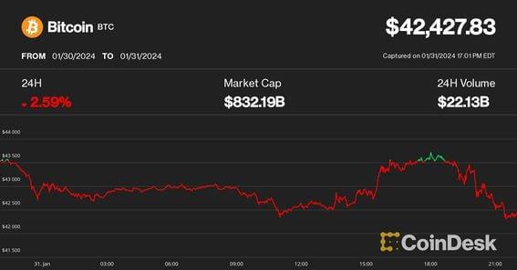 "The market has gotten ahead of itself on the rates side," said one analyst. Federal Reserve chair Jerome Powell tempered expectations of an imminent interest rate cut in March during Wednesday's FOMC press conference. Bitcoin dipped to $42,300, while crypto majors ETH, ADA, DOT fell 3%-4% with Solana's SOL tumbling over 6%. Bitcoin remains in a channel consolidating without clear direction between $42,000 and $44,000, Swissblock said. Cryptocurrencies tumbled lower Wednesday with bitcoin (BTC) sliding below $43,000 as Federal Reserve Chair Jerome Powell's hawkish comments cooled hopes about an imminent rate cut. In a universally anticipated move, the Fed left its benchmark fed funds rate range unchanged at 5.25%-5.5% following the first Federal Open Market Committee meeting of the year. Market participants were more keen to monitor clues about when the Fed might start lowering rates, with many observers expecting it to happen as soon as the next meeting in March. "Based on the meeting today," said Powell at his post-meeting press conference, "I don't think it's likely that the committee will reach a level of confidence by the time of the March meeting to identify March as the time to [cut]." Risk assets including cryptos turned sharply lower in the immediate aftermath of that remark. BTC fell to $42,300 from its daily high of $43,700 and was down 2.3% over the past 24 hours. The CoinDesk 20 {{CD20}} index, a broad crypto market benchmark that covers some 90% of the total market value of digital assets, declined nearly 3% during the same time. Other major cryptocurrencies such as ether (ETH), Cardano's ADA, Avalanche's AVAX and Polkadot's DOT dropped 3%-4%, while Solana's SOL lost over 6% during the day buckling below $100. In traditional markets, the Nasdaq tumbled 2.2% and the S&P 500 1.6%. "The market has gotten ahead of itself on the rates side," Alex Krüger, macro analyst and co-founder of Asgard Markets, said in a X post. "Cuts starting in May or June, not March." Indeed, the odds of a March rate cut have been trimmed to a current 34.5% from about 65% prior to today's developments, according to the CME FedWatch Tool. Ruslan Lienkha, chief of markets at Web3 fintech platform YouHodler, said that "any possible hawkish rhetoric about the longer-than-expected time of high rates may trigger a correction in the stock market and as a consequence, capital outflow from risk assets such as bitcoin." However, bitcoin's move to downside could be limited as the largest crypto appears to be consolidating between $44,000 and $42,000 without clear direction, Swissblock analysts said in a Wednesday market report. The $42,000 area and below the $40,000 level could act as key support levels for the price where buyers might step in, the report added. https://www.coindesk.com/markets/2024/01/31/bitcoin-dips-to-424k-as-feds-powell-pours-cold-water-on-march-rate-cut/
