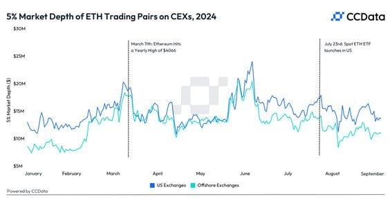 Order book liquidity refers to the market's ability to absorb large buy and sell orders without influencing the spot price. Ether's 5% market depth on U.S. exchanges has dropped by 20% since the introduction of spot ether ETFs in the U.S. Poor market conditions and seasonality effects are to be blamed, according to CCData. Exchange-traded funds (ETFs) will be net positive for market liquidity, making it easier to execute large buy and sell orders at stable prices. That's what CoinDesk reported in December 2023, before the ETFs were approved in the U.S. The liquidity boost materialized well enough in the bitcoin (BTC) market following the debut of spot ETFs on Jan. 11. With ether (ETH), however, the story played out differently. Ether's order book liquidity has declined since the July 23 debut of nine ETFs, according to data tracked by London-based CCData. Since the ETFs' introduction, the average 5% market depth for ETH pairs on U.S.-based centralized exchanges has declined by 20% to roughly $14 million. On offshore centralized venues, it's dropped by 19% to around $10 million. In other words, it's actually now easier to move the spot price by 5% in either direction, a sign of reduced liquidity and increased sensitivity to large orders. "Although the market liquidity for ETH pairs on centralized exchanges remains greater than what was at the beginning of the year, the liquidity has dropped by nearly 45% since its peak in June," Jacob Joseph, a research analyst at CCData, told CoinDesk in an interview. "This is likely due to the poor market conditions and the seasonality effects in the summer, often accompanied by lower trading activity." The measure refers to the amount of buy and sell orders within 5% of the mid-market price for an asset. Greater depth indicates strong liquidity and lower slippage costs. CCData considered the 5% market depth for all ETH pairs on 30 centralized exchanges. Ether ETFs have witnessed a cumulative outflow of over $500 million since July 23, according to data tracked by Farside Investors. Ether's price has declined by over 25% to $2,380, CoinDesk data show. https://www.coindesk.com/markets/2024/09/06/weeks-after-ether-etf-debut-eth-market-liquidity-has-dropped-by-20/