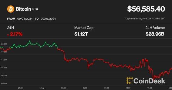 Bitcoin tumbled below the $56,000 level on Thursday before a modest bounce. Cryptocurrencies continued trending to the downside as recession fears weighed on risk assets ahead of Friday's key jobs data report. Bitcoin (BTC) declined more than 4% at one point Thursday before bouncing to $56,500 at press time, off 2.2% over the past 24 hours. Ethereum's ether (ETH) declined over 4% during the same period, trading below $2,400. The broad-basket CoinDesk 20 Index was down more than 3%, with dogecoin (DOGE), cardano (ADA) and litecoin (LTC) outperforming. Native token of layer-1 blockchain Aptos (APT) tumbled 7%, the largest loser among the CoinDesk 20 constituents, as an upcoming token unlock event weighed on its price. Some $65 million worth of locked tokens, 2.3% of the current supply, will be added to circulation next week including to early investor, per Token.Unlocks data. Cryptocurrencies usually underperformed the broader market in a window of seven days before and after large token unlocks over past years, a recent Messari research concluded analyzing hundreds of unlock events over the past years. Looking at traditional markets, key U.S. equities declined during the morning session in a broader risk-off sentiment. The Dow Jones Industrial Average (DJIA) was down 0.9%, while the broad-based S&P 500 lost 0.5% by 12:00 Eastern time. The tech-heavy Nasdaq 100 erased its opening gains and stood mostly flat. Crypto-focused stocks also performed poorly. Crypto exchange giant Coinbase (COIN) declined 1%, briefly slipping below $160 for the first time since February, taking out the lows hit during the early August crash due to the Japanese yen carry trade unwind. Large-cap bitcoin miners Marathon (MARA) and Riot Platforms (RIOT) were down 4% and 2%, respectively. https://www.coindesk.com/markets/2024/09/05/aptos-leads-losses-as-crypto-weakness-continues-coinbase-shares-fall-to-7-month-lows/