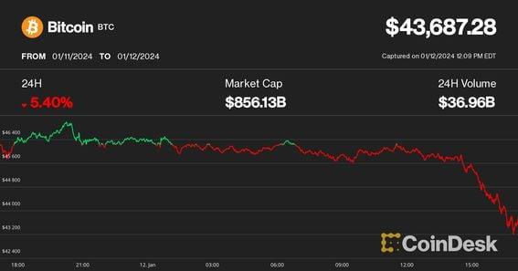 Previous landmark events such as Coinbase's stock exchange listing and ProShares' futures-based bitcoin ETF debut happened near market tops. Bitcoin tumbled below $42,000 in a Friday sell-off with cryptocurrency-focused stocks plummeting as Thursday's bitcoin ETF euphoria turned into a market rout. The $42,000 level is a significant support where prices may bounce from with potential buyers stepping in, crypto research firm Swissblock said. Bitcoin (BTC) dropped below $42,000 on Friday, plunging almost 10%, as the euphoria over the bitcoin ETFs approved this week gave way to a massive rout. Bitcoin had been as high as $46,000 earlier Friday and surged to a two-year high of $49,000 on Thursday, when bitcoin ETFs began trading in the U.S. But the heady prices didn't last long. Shares of Coinbase (COIN), the crypto exchange that provides vital custody services to most of the ETF issuers, lost 7.4% on Friday. Bitcoin miners Marathon Digital (MARA), Hut 8 (HUT) and Riot Platforms (RIOT) all sank at least 10%; Marathon fared worst, slumping 15%. The declines happened a day after spot bitcoin exchange-traded funds (ETFs) began trading, marking a significant milestone for the industry. Bitcoin ETFs are traditional financial vehicles that may give retail and institutional investors alike easier exposure to bitcoin's price. Friday's price declines may not be a surprise; research firm CryptoQuant predicted last month that bitcoin would fall to as low as $32,000 in the next month after an ETF approval, being a "sell the news" event. Notably, previous landmark events such as Coinbase's stock market listing in April 2021 and ProShares' futures-based bitcoin ETF (BITO) debut in October 2021 happened near a significant peak in crypto prices, possibly foreshadowing cooling prices ahead. What's next for bitcoin price Bitcoin posted a massive 80% rally since early October without significant pullbacks to a hit a two-year high as anticipation increased to a fever pitch into Thursday's spot bitcoin ETF launch, a significant milestone for the digital asset industry that expands investor access to the largest crypto asset. Crypto research firm Swissblock noted in a Friday market report that the last leg of the bitcoin rally to $49,000 into Thursday's bitcoin ETF launch showed signs of running out of fuel, with sellers stepping in above the $47,500 price level. "The recent dynamics in bitcoin have not lived up to the expectations set by many bitcoin maximalists, with the asset failing to break the $50k mark, and the hype surrounding ETFs showing signs of cooling down," Swissblock analysts wrote. "The critical question now is whether the market can sustain upward momentum." The $42,000 price level forms a significant liquidity zone where bitcoin may bounce from as buyers might enter the market, the report explained. If this support level falters, the next key zone to watch is the "CME gap" at $40,000, it added. https://www.coindesk.com/markets/2024/01/12/btc-tumbles-below-44k-bitcoin-miners-drop-10-boosting-etf-sell-the-news-calls/