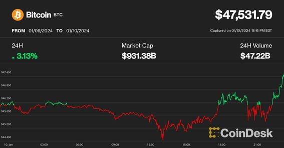 Now, attention turns to how much demand these investment vehicles will attract. Bitcoin wobbled then rose past $47,000 following regulatory approval of spot bitcoin ETFs. Ether jumped 11% to a 20-month high as ETF speculation turns to the second-largest asset. The wider impact of the ETFs will take months to see, 21Shares co-founder Ophelia Snyder said in an interview. Bitcoin (BTC) and other cryptocurrencies surged on Wednesday after U.S. regulators approved bitcoin ETFs, a landmark decision for the digital asset industry that could dramatically broaden the investor base for bitcoin. For full coverage of bitcoin ETFs, click here. Bitcoin recently traded around $47,500, up from just below $46,000 before the news broke Wednesday afternoon. Ethereum's ether (ETH), the second-largest crypto by market capitalization, jumped 11% and exceeded $2,500 for the first time in 20 months as attention turns to U.S. applications for ether ETFs. Michael Silberberg, head of investor relations at crypto hedge fund Alt Tab Capital, said to expect "frothy price accumulation as capital will flow into the market from a new class of institutional buyers to crypto." Shares of the Grayscale Bitcoin Trust (GBTC), the largest closed-end bitcoin fund that now has permission to convert into an ETF, popped to $40, their highest price since December 2021, TradingView data shows. The stock price of Coinbase (COIN), the digital asset exchange whose custody service plays a key role for most bitcoin ETF issuers, was flat around $151. Bitcoin miners Marathon Digital (MARA) and Riot Platforms (RIOT) also remained unchanged. Anticipation of the first bitcoin ETFs in the U.S. that can hold bitcoin, instead of just derivatives, has been a boon to the crypto market since Wall Street giant BlackRock filed paperwork in June to create one – a move soon followed by other applicants. These vehicles are considered superior to already listed futures-based offerings, with bulls betting they will attract significant inflows to the largest cryptocurrency. What's next for crypto prices Despite 10 years of failed attempts to list spot bitcoin ETFs in the U.S., most market observers overwhelmingly expected regulatory approval this time, given BlackRock's track record of successful applications and asset manager Grayscale's court victory over the agency in August. Now, attention turns to how much demand these investment vehicles will attract when they start trading. While the ETFs may trade as soon as Thursday, the wider impact of the products will be seen in months, Ophelia Snyder, co-founder of crypto investment product issuer 21Shares, said in a CoinDesk interview. Bartosz Lipiński, CEO at crypto trading platform Cube.Exchange, pointed out that ether outperformed bitcoin amid the news, suggesting that altcoins will also benefit. "It's been a while since the second-largest digital asset moved 10% in a single day, so this is rather substantial," Lipiński said in an emailed note. "Looking forward, it would make sense to see BTC eventually resume rallying higher as supply becomes more scarce while these 11 ETFs begin to gobble up significant amounts of supply," he explained. "With bitcoin potentially becoming harder to buy, it would also make sense that other coins begin to fill the void left behind." "ETH, solana (SOL), Polygon (MATIC), and others could greatly benefit from this desire to find additional opportunities elsewhere in the digital assets ecosystem," Lipiński added. https://www.coindesk.com/markets/2024/01/10/bitcoin-wobbles-below-46k-ether-and-grayscales-gbtc-jump-as-sec-approves-spot-bitcoin-etfs/