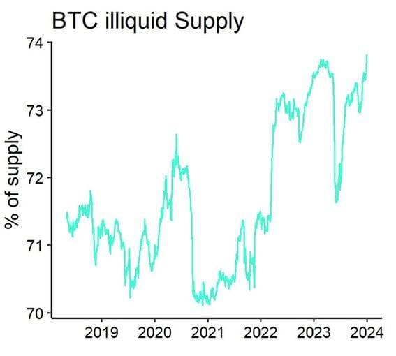 According to ETC Group, the new high is a sign that the halving-induced supply shock is intensifying. The illiquid bitcoin has risen to a record high of 74% of the circulating supply. The level reflects the increasing scarcity of BTC in the market and a potential bullish impact on its price. Almost three-quarters of bitcoin produced is considered illiquid, a record level that suggests increasing scarcity of the cryptocurrency in the market and a potential bullish impact on its price. Data tracked by ETC Group and Glassnode shows that illiquid entities now own 14.61 million BTC, worth over $826 million at current prices, equating to 74% of the cryptocurrency's total circulating supply of 19.75 million. "Bitcoin's illiquid supply reached a new all-time high of almost 74% of circulating supply according to data provided by Glassnode, signaling that the Halving-induced supply shock is actually intensifying. This should provide an increasing tailwind for Bitcoin and other crypto assets over the coming months," André Dragosch, head of research at ETC Group, said in a report shared with CoinDesk. Glassnode identifies illiquid entities based on the ratio of cumulative outflows and inflows over the entity's lifespan. Increasing BTC scarcity in the market means a pick-up in demand could have an outsized bullish impact on the cryptocurrency's going market rate. As of writing, BTC was changing hands at $56,600. The bull run has stalled since prices hit lifetime highs above $70,000 in the first quarter. https://www.coindesk.com/markets/2024/09/04/illiquid-bitcoin-entities-now-control-record-74-of-btcs-circulating-supply/