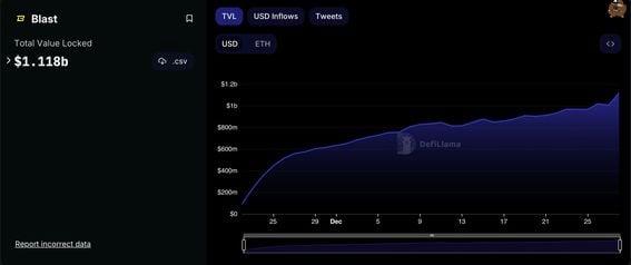 Depositors will receive an airdrop that can be redeemed in May 2024. Blast, the recently announced layer 2 blockchain set up by the developers of non-fungible token (NFT) platform Blur, has surpassed $1.1 billion in deposits, attracted by an airdrop promised for May even though the platform is not due to go live until February. Speculators, unperturbed by the controversial one-way bridge to Blast, have deposited $1 billion worth of staked ether (stETH) and $103 million worth of the dai (DAI) stablecoin since the website went live last month, according to DefiLlama. In return, depositors receive a yield of around 5% on their staked assets as well as "Blast Points," which can be redeemed for an airdrop that will be distributed in May. Users can also accrue points by referring others to the platform. Blur ran a similar airdrop after setting up an NFT marketplace in February. The BLUR token now has a market cap of $500 million, having risen by 23% over the past month. The idea of allowing deposits to a platform that is not yet live has attracted criticism from sections of the crypto industry, with some suggesting that the project has the hallmarks of a pyramid scheme where early depositors and affiliate marketers will receive a lion's share of the eventual airdrop. Some of that criticism even came from Blast's backers, venture capitalist firm Paradigm. Paradigm Head of Research and General Partner Dan Robinson said Blast's marketing campaign "crossed lines" and that Paradigm doesn't agree with rolling out deposits before the blockchain or withdrawals are live. Robinson did, however, say that he is excited about several components of Blur. It's worth noting that crypto asset prices have surged across this board this year. Bitcoin (BTC) has risen more than 150% to around $43,000 while ether (ETH) has doubled to $2,400. The increase has spurred a wave of optimism across investors, which is highlighted by the rapid rise of projects like Blast. https://www.coindesk.com/business/2023/12/28/blast-hits-11b-in-deposits-more-than-a-month-before-its-due-to-go-live/