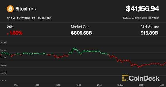 Longs continue to get liquidated as the price of bitcoin and other major digital assets gyrate. Bitcoin (BTC) opened the trading week marginally higher, trading above $41,000. Ether (ETH) was also up slightly, trading above $2,100. Data from Coinglass have been $103.5 million in liquidations of token-tracked futures in the past 12 hours, and $95 million of them have been longs, or bets on higher prices. Of the $103.5 million in total liquidations, $33 million in bitcoin positions were liquidated, with $29 million of those being long bitcoin positions. Lucy Hu, a Senior Analyst with Hong Kong-based digital asset management firm Metalpha says the broader market continues to hold up quite well despite the recent Ledger hack with rate cuts on the horizon and things like ordinals driving more interest in bitcoin. “The massive Ledger hack did swing some sentiment in the DeFi space and raises important questions on wallet security," she said in an email interview. “Besides, the stellar rise of Bitcoin Ordinals continues to fuel enthusiasm for Bitcoin miners, who have been heavily rewarded. We expect the long-term growth momentum of Bitcoin to remain on track." Predictions still optimistic Despite bitcoin’s current correction phase, end-of-year predictions for 2024-2025 still remain optimistic, especially when compared to last year's dour predictions of $10-12k bitcoin. In a recent end-of-year report, Woo Network targets a $75K price point for BTC for “early 2024.” Bitwise, has a similar price target, with the fund predicting that bitcoin will trade above $80,000. “Spot bitcoin ETFs will be approved, and collectively will be the most successful ETF launch of all time," Bitwise also predicted. "Coinbase’s revenue will double, beating Wall Street expectations by at least 10x." Memecoins clogging up Layer-1s Gas fees are spiking on Ethereum and many layer-1 chains, such as Avalanche, as dozens of new meme coins flood the market. Avalanche has generated $5 million in fees over the last 24 hours, while Ethereum, with its significantly larger market cap, has generated $13.52 million. Arbitrum and Optimism have also seen a large spike in gas fees during the last week. Some of these layer-1 tokens declined faster than bitcoin or ether, with AVAX down 6% and Solana’s SOL token down 4%. https://www.coindesk.com/markets/2023/12/18/bitcoin-dips-under-41k-to-begin-the-week-in-red-as-memecoin-ordinals-frenzy-clogs-up-blockchains/
