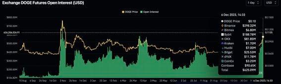 An increase in open interest alongside a rise in price is said to confirm an uptrend. Bitcoin's recent rapid rally has revived risk-taking in the crypto market, spurring investors to pour money into non-serious cryptocurrencies like dogecoin (DOGE), which was created as a joke 10 years ago. DOGE, the world's leading meme cryptocurrency, has gained over 10% in the past 24 hours to trade above $0.10 for the first time since April, according to data tracked by TradingView. The prices has gained 27% in seven days, seemingly tracking bitcoin's surge to $44,000 from $38,000. The notional open interest – or the dollar value locked in the number of active futures and perpetual futures contracts – tied to DOGE has risen by 58% to $625 million in one week, reaching the highest since Nov. 2, 2022, according to data source CoinGlass. That increase, alongside a rising price, is said to confirm the uptrend. Funding rates on several exchanges have surged to an annualized 50% or more, indicating a steep premium in perpetual futures relative to spot prices, Velo Data data show. Positive rates indicate investor preference for long, or bullish, bets and reflect collective optimism that prices will likely increase. Joke cryptocurrencies are high-beta assets with a history of moving in the direction of bitcoin, only more so. In other words, they behave as leveraged plays on the largest cryptocurrency. Thus, investors should be watchful of potential extreme bullish action in DOGE relative to bitcoin as an indicator of speculative froth often observed at the tail end of the marketwide bullish trend. DOGE's latest surge, though impressive, isn't necessarily a sign of excess greed, considering the DOGE/BTC ratio remains at bear-market depths. A rapid surge in the ratio presaged BTC's April 2021 top above $60,000 and the market-wide FTX-induced panic of November 2022. https://www.coindesk.com/markets/2023/12/06/over-600m-locked-in-open-dogecoin-futures-as-doge-price-hits-highest-since-april/