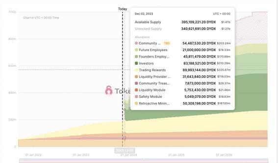 The decentralized exchange debuted its layer 1 blockchain based on Cosmos this week. DYDX, the native token of the newly-released dYdX chain, has risen by more than 20% in the past 24 hours, just 16 days before more than $500 million worth of tokens will be unlocked to early investors and core team members. The surge in the DYDX price comes as the project, previously just a decentralized exchange (DEX), launched its layer-1 blockchain based on Cosmos – a move that enables validators to receive a portion of trading revenue as a reward for staking. Over the past 30 days, DYDX has more than doubled in price as speculators anticipated the token's migration from Ethereum to the dYdX chain. However, a large token unlock in just over two weeks has the potential to damp spirits. There are 179 million DYDX tokens in circulation, and the upcoming unlock will increase that to 395 million, according to token.unlocks. The unlock was meant to take place in January this year, but was shelved until December, a decision that spurred an initial price hike earlier this year. Research published earlier this year from The Tie reveals that large token unlocks lead to a decline in price as demand for the asset can't keep pace with the increase in supply, known as inflation. DYdX CEO Antonio Juliano has attempted to remedy that by incentivizing staking, a method that involves locking tokens on a blockchain to receive rewards. Juliano revealed on Tuesday that stakers will receive "cold hard USDC," for staking and that validators will receive 100% of trading fees. USDC is a dollar-pegged stablecoin. https://www.coindesk.com/markets/2023/11/15/dydx-pumps-ahead-of-massive-500m-token-unlock/