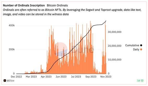 Higher fees are also boosting bottom lines for the industry's beleaguered miners, 21Shares noted. Network fees on Bitcoin surged to near $7 amid resurgence of Ordinals inscriptions. Bitcoin toppled Ethereum in NFT sales volume on Wednesday, per CryptoSlam data. Bitcoin fees surged to the highest level since the meme coin mania this past May amid the resurgence of Bitcoin-linked non-fungible tokens (NFT), known as Ordinals. At $6.84 on Wednesday, average transaction fees for using the Bitcoin blockchain are now up roughly 970% from a low of $0.64 touched in August, BitInfoCharts data shows. The surge is driven by increasing minting of Ordinals, with nearly 1.9 million inscriptions uploaded to the blockchain over the past two weeks, digital asset management firm 21Shares pointed out in a report Wednesday. Bitcoin became the top blockchain by NFT sales volume (excluding wash trading) in the past 24 hours, toppling Ethereum, CryptoSlam data shows. Ordinals – a protocol that allows users to store NFTs on Bitcoin – saw a spike in demand this spring during a short-lived meme token craze and drove fees to almost 2-year highs. Binance, the world's largest crypto exchange, listed Ordinals' token ORDI earlier this week and it almost doubled in price before giving up some of its gains Wednesday. "While ordinals have been limited to memecoin implementations, they do act as a proxy for increasing demand for Bitcoin blockspace," 21Shares analysts said. The resurgence of Ordinals also helps the bottom line of bitcoin miners, the report pointed out, with blockchain transaction fees now making up about 8.5% of their revenue. This is of particular import for the miners as Bitcoin's quadrennial halving event expected in April 2024 is drawing nearer, which will cut block rewards for the industry in half. https://www.coindesk.com/markets/2023/11/08/bitcoin-fees-soar-nearly-1000-since-august-as-ordinals-are-back-in-vogue/