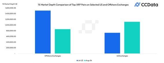 Order books on U.S. exchanges offer more liquidity than their offshore counterparts, according to CCData. XRP's order book on U.S. exchanges is 30% more liquid than offshore platforms. The greater the liquidity or market depth, the easier to execute large transactions at stable prices. XRP is having its moment not just in terms of price rally but also enhanced liquidity on U.S. exchanges, a positive development for whales looking to trade large quantities at stable prices stateside. As of Thursday, U.S. exchanges, including Nasdaq-listed Coinbase (COIN) and Kraken, boasted a 1% market depth of $1.12 million, offering 30% greater order book liquidity than offshore exchanges like Binance and OKX, according to data tracked by CCData. In other words, a trade transaction worth at least $1.12 million must go through U.S. exchanges to move the spot price by 1% in either direction. A relatively smaller amount could do the same on offshore exchanges. The 1% market depth on U.S. avenues has increased 53% since July last year, outpacing the 43.2% improvement on offshore platforms. Market depth refers to the market's capacity to handle large buy and sell orders without causing significant fluctuation in the concerned asset's going market price. The depth is quantified by analyzing the number of active buy and sell orders at various price levels. The 1% depth, which focuses on orders within the 1% range of the currency market rate, is widely used to assess liquidity conditions. The greater the depth, the easier it is to execute large orders with minimal slippage and vice versa. Trading volume in XRP markets offered by U.S. exchanges has also picked up, although offshore exchanges remain dominant. U.S. platforms' now account for 14% of the global XRP volume, matching the levels seen four years ago, according to Paris-based Kaiko. The relative improvement in trading conditions on the U.S. exchanges likely stems from dwindling regulatory uncertainty. "Since last year's landmark court ruling, which granted Ripple Labs a partial victory against the SEC, demand for XRP in U.S. markets has grown steadily," Kaiko said in a weekly note. Last year, fintech company Ripple scored a partial victory in its long-pending battle against the Securities and Exchange Commission after a court ruled that Ripple's Institutional sales of the XRP, and not sales to retail investors, amounted to an unregistered securities offering. The regulator sued Ripple for violating securities law in late 2020, leading to the XRP price crash and prompting the U.S. exchanges to delist the token. Early this week, a federal court imposed a $125 million penalty on Ripple for its institutional sales of XRP. The amount, however, fell well short of the $2 billion the SEC had sought, sending XRP's price higher by 20%. https://www.coindesk.com/es/markets/2024/08/09/heres-why-xrp-whales-may-prefer-us-exchanges-over-offshore-venues/