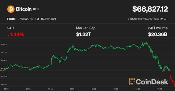 The price of bitcoin still appears poised to close out July with sizable gains after plunging below $54,000 earlier in the month. In what's become a familiar pattern over the past few months, a rally in bitcoin (BTC) to a key level was met with a wave of selling as the price during Monday morning U.S. hours quickly plunged more than 3% after pushing above $70,000 for the first time since early June. At press time, bitcoin was changing hands at $67,800, roughly flat over the past 24 hours. The broader CoinDesk 20 Index was higher by 1.1% over the same time frame, helped along by sizable gains for bitcoin cash (BCH), litecoin {LTC}} and solana (SOL). Traders will be familiar with this price pattern in 2024, which first manifested itself in mid-January when bitcoin climbed to a multi-year high of $47,000 just after the spot ETFs opened for trade. That move higher was reversed within minutes and bitcoin days later had tumbled below $40,000 before the uptrend began anew. Similar price action was seen in early March after bitcoin pushed to a what was then a new all-time high above $69,000 and just hours later found itself below $60,000. Later that month, a move to another record above $73,500 was snuffed out in quick fashion and more than four months later that level hasn't again been challenged. While the above might be frustrating to leveraged traders and their profit and loss, technicians might note a pattern as each of those examples shows higher highs and higher lows – the sort of "up and to the right" chart that bulls like to see. Indeed, earlier in July, bitcoin plunged below $54,000 as a German government entity began unloading its stash of 50,000 tokens seized as part of a criminal case. Yet just a couple of days before August hits, bitcoin is poised to close the month with a sizable gain from the $63,000 area in which it begun. https://www.coindesk.com/markets/2024/07/29/bitcoin-pulls-back-sharply-after-touching-70k/