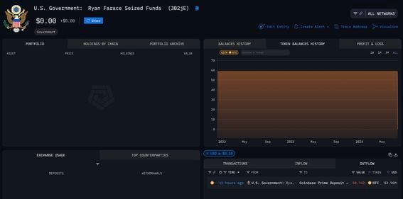 An address labeled "U.S. Government: Ryan Farace Seized Funds" moved BTC worth nearly $4 million to Coinbase 11 hours ago. An address labeled "U.S. Government: Ryan Farace Seized Funds" moved BTC worth nearly $4 million to Coinbase 11 hours ago, according to Arkham Intelligence. The potential selling pressure represents less than 1% of BTC's 24-hour trading volume. The U.S. government transferred 58.742 bitcoin (BTC), worth nearly $4 million, to Coinbase (COIN) on Monday, according to data tracked by blockchain analytics firm Arkham Intelligence. The transfer originated from an address labeled "U.S. Government: Ryan Farace Seized Funds" and identified onchain as 3B2jEBZi8fJWGEDrh6Pe7hDMaJ6iGfFtaU. The funds were seized three years ago from Ryan Farace, who was convicted in 2018 for selling Xanax pills on the dark web. Later Ryan's father, Joseph Farace, was convicted as well for laundering and trafficking bitcoin proceeds intended for federal forfeiture. The Department of Justice eventually recovered 2,933 BTC from the father-son duo and announced its intention to liquidate holdings in January of this year. The latest movement of funds, perhaps a move aimed at liquidation, has emptied the Ryan Farace seized funds address and represents less than 1% of bitcoin's 24-hour trading volume of over $35 billion, according to data source Coingecko. As such, the potential liquidation of funds through Coinbase is unlikely to negatively impact the spot price significantly as the recent large sale of BTC by Germany's Saxony state did. Saxony sold 49,858 BTC between June 19 and July 12, driving the token's spot price as low as $53,500 at one point. As of writing, the leading cryptocurrency by market value changed hands at $67,450. Meanwhile, the U.S. government still held over 213,000 BTC worth over $14 billion. https://www.coindesk.com/markets/2024/07/23/us-government-moves-4m-bitcoin-to-coinbase-arkham-data-show/