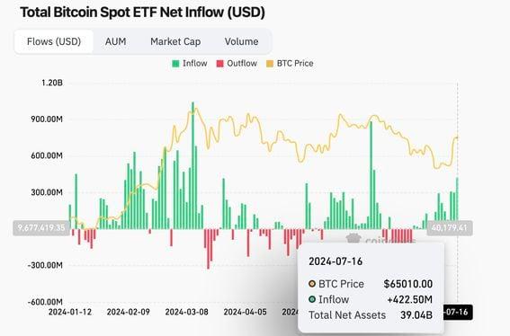 BTC's price has recovered 23% since hitting lows near $53,500 on July 5. The 11 spot BTC ETFs listed in the U.S. recorded a cumulative inflow of $422.5 million on Tuesday. The funds have collected over $1 billion in the past three trading days alone. BTC's price has recovered 23% since hitting lows near $53,500 on July 5. The U.S.-listed exchange-traded funds that closely track bitcoin's (BTC) spot price are back in demand and how. On Tuesday, the 11 funds recorded a cumulative net inflow of $422.5 million, the highest single-day tally since June 5, extending the seven-day winning run, according to data tracked by Farside Investors and Coinglass. BlackRock's IBIT amassed over $260 million on Tuesday, accounting for a giant share of the cumulative inflows. FBTC drew $61.1 million, while others, except GBTC, DEFI and BTCW, pulled in less than $30 million each. These funds have collectively drawn in over $1 billion in just the last three days, underscoring investors' confidence in bitcoin's price prospects. BTC has surged 23% to $65,800 since hitting a low near $53,500 on July 5, CoinDesk data. In addition to the ETF inflows, the price recovery may be linked to the exhaustion of selling pressure from Germany's Saxony state, dramatic improvement in the probability of pro-crypto Republican candidate Donald Trump winning the U.S. presidential election on Nov. 4 and Trump's decision to appoint BTC-holder and Ohio Republican senator James David Vance as vice president. Vance has supported BTC and digital assets since 2021 and began circulating a draft version of crypto legislation last month. "It is notable that Vance advanced crypto legislation at a moment when he knew he was being considered by Trump for VP. This highlights the new-found political relevance of crypto, but also the extent to which digital asset policy has become a part of the Republican vision for the US economy," FRNT Financial said in the newsletter Tuesday. "Additionally, given that Trump can only serve another four years if elected, the VP decision was also seen as a choice on political succession. It is additionally encouraging for the crypto community that Trump’s seeming political successor is a BTC holder and has prioritized crypto-friendly legislation," FRNT added. It's also likely that with the supply overhang from Saxony behind us, the crypto market is catching up the sustained rally in technology stocks on Wall Street. Such is the optimism that reports of renewed creditor reimbursements from defunct exchange Mt. Gox on Tuesday failed to keep BTC prices under pressure for long. https://www.coindesk.com/markets/2024/07/17/bitcoin-etf-inflows-hit-six-week-high-of-4225m/