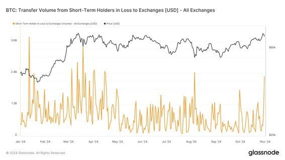 Over $2 billion worth of bitcoin was sent to exchanges at a loss on Thursday, the most since August's yen carry trade unwind, as bitcoin fell below $70,000. On Thursday, short-term holders sent over $2 billion worth of bitcoin to exchanges at a loss, the most since the yen carry trade unwind on Aug. 5. In the past three days, short-term holders sent more than $6 billion worth of bitcoin to exchanges at a profit, locking in gains as the month drew to a close. Disclaimer: The analyst who wrote this piece owns bitcoin. Short-term holders of bitcoin (BTC) sent about $2.3 billion, some 32,000 tokens, of the largest cryptocurrency to exchanges at a loss on Thursday as the price dropped below $70,000 after approaching an all-time high earlier in the week. The panic selling was the most since Aug. 5's yen carry trade unwind. Short-term holders — investors who have held bitcoin for less than 155 days — tend to panic and sell when the price drops, and buy when there is euphoria or greed in the market. In total, they sent over 54,000 BTC to exchanges on Thursday, the highest amount since Mar. 27. A number of factors may be playing into the recent drop, which has taken BTC to about 6% below its record. A U.S. presidential election is coming on Nov. 5, with investors most likely reducing their exposure to risk, which they tend to do on the last day of the month. We also witnessed an almost $1 trillion wipeout of the U.S. stock market on Thursday, with every one of the so-called magnificent seven tech stocks in the red. Breaking down Thursday's 54,000 bitcoin into profit and loss, CoinDesk research has shown continued profit-taking as bitcoin inched closer to March's record high. On Thursday, 22,000 BTC was sent to exchanges in profit, and over the past three days, over $6 billion of bitcoin was sent to exchanges in profit. Bitcion rose 11% last month. Considering the 155-day timespan to be considered in this category, the investors would have most likely bought this week. Bitcoin rose above $70,000 in May and July and holders then didn't seem phased by the subsequent 20% drawdowns, a sign they're not likely to be shaken out by a 6% price drop. Due to uncertainty around the U.S. election, bitcoin will likely not reach new all-time highs until after result is known. https://www.coindesk.com/markets/2024/11/01/bitcoins-drop-on-thursday-spurred-panic-sales-among-short-term-holders-van-straten/