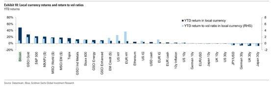 Gold has a significantly higher volatility ratio than bitcoin in 2024, according to analysis by Goldman Sachs. BTC's price surge doesn't compensate for the price volatility risks, a chart by Goldman Sachs shows. Gold's relatively higher risk-adjusted returns explains its safe haven appeal. Bitcoin (BTC) has surged over 40% this year, outshining major equity indices, fixed-income securities, gold and even oil, which recently rose on the back of geopolitical tensions. However, according to data tracked by Goldman Sachs, its stellar performance in absolute terms is not sufficient to compensate for its volatility. Bitcoin's year-to-date return to volatility ratio is under 2%, significantly lower than gold's industry-leading risk-adjusted return of around 3%. The ratio gauges the return an investment generates per unit of risk/volatility. The yellow metal has gained 28% in absolute terms. In fact, Ethereum's native token ether, Japan's TOPIX index, and the S&P GSCI Energy Index are the only non-fixed income growth-sensitive investments with return to volatility ratios lower than bitcoin, the chart from Goldman's Oct. 7 note titled "Oil on the boil" shows. That relatively low risk-adjusted performance validates crypto skeptics' long-held view that bitcoin is too volatile to become a safe haven like gold. It also helps explain why gold rose and bitcoin tumbled alongside equity markets last week after Iran launched missiles at Israel, ratcheting up tensions in the Middle East. The low risk-adjusted returns make directional bets unattractive and likely explain the popularity of the bitcoin cash and carry arbitrage among traditional institutions. The arbitrage strategy allows traders to bypass price volatility risks while profiting from price discrepancies between spot and futures markets. 12:25 UTC: Corrects BTC and gold's YTD return to volatility ratios to less than 2% and around 3%, respectively. https://www.coindesk.com/markets/2024/10/08/bitcoin-up-40-ytd-but-gold-wins-on-risk-adjusted-returns/