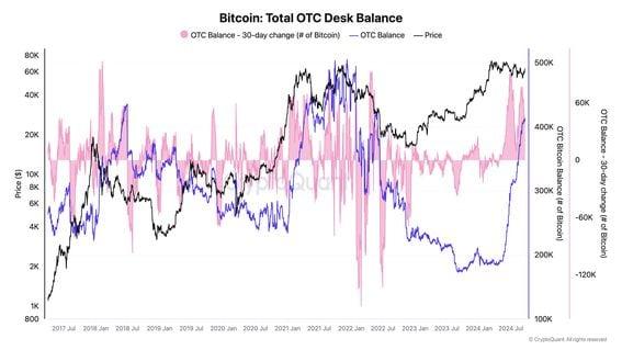 The amount of bitcoins on OTC desks has doubled over the past five months to the highest level since May 2022. The OTC bitcoin balance has reached a 2.5 year high of 410,000 tokens. The run-up is similar to that which took place during the bull run of late 2020 into early 2021. A decline in bitcoin balances will likely be necessary for a continuation of the recent bull run. One possible headwind to the idea of 'Uptober' and a general fourth quarter rally for bitcoin (BTC) is the recent surge in tokens moving to over-the-counter (OTC) desks. Data from CryptoQuant suggests there are over 410,000 bitcoins in total on OTC desks, the highest since May 2022 and more than double the 185,000 seen back in March. The balance can indicate the amount of liquidity available at an OTC desk for purchase or sale, with a high balance showing strong liquidity and the ability for trading desks to fulfill large orders. A lower balance is the opposite and may indicate more difficulty in making trades. Who uses OTC desks? Clients are mainly high-net-worth individuals or institutions outside retail exchanges. Making trades OTC allows sizable buys and sells without impacting the price of bitcoin on traditional exchanges. The data show that the OTC balance has shot up in the past six months while bitcoin has been ranging in a downwards channel from its all-time high above $73,500 in March. The run-up in balances is fairly similar to that seen in late 2020 into early 2021 when the OTC balance shot up from 235,000 to 435,000 tokens in six months. The difference is that bitcoin's price was on the rise then, but modestly downward now. In the bear market of 2022, the OTC balance dropped alongside the decline in bitcoin's price, suggesting net buying. If bitcoin is to continue its bull run into the fourth quarter, one factor will likely be the need to see a drop in OTC desk balances. https://www.coindesk.com/markets/2024/10/01/bitcoin-bull-run-in-question-as-balances-on-otc-desks-rise-to-410k/