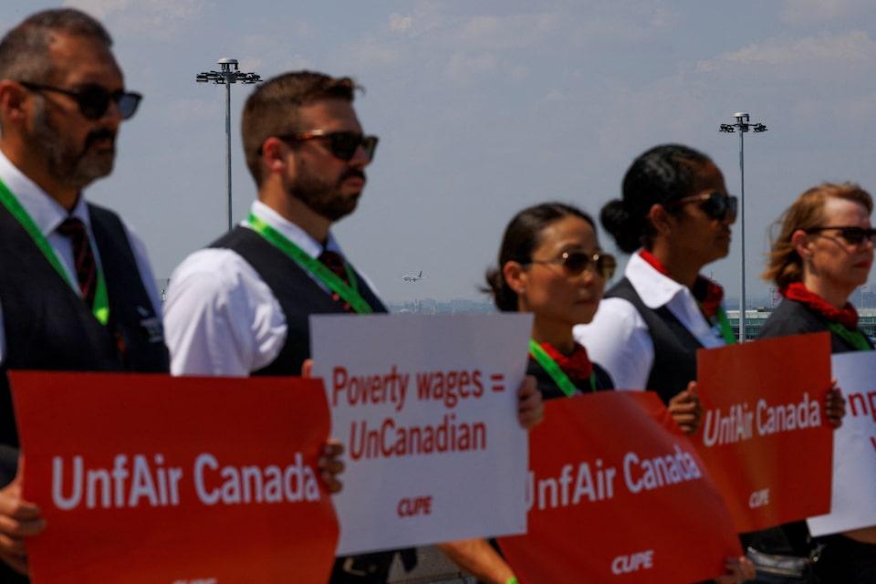 Cabin crew protest unpaid work at Canadian airports Union seeks pay for non-flight tasks, higher wages for new recruits Air Canada said it would make attendants best paid in Canada MONTREAL/TORONTO Aug 11 (Rtrs) - Hundreds of cabin crew members took their fight to major Canadian airports on Monday, picketing against unpaid labor, as talks on wages intensify between Air Canada AC.TO and its flight attendants this week ahead of a possible strike. A group of 700 mostly female flight attendants in crisp dark grey uniforms demonstrated at Toronto Pearson International Airport, donning signs with messages like "unpaid work won't fly," according to The Canadian Union of Public Employees, which said the contention is a key issue in contract talks with the carrier as a possible strike may come as early as August 16. Sign up here. A walkout during the busy summer travel season would be a blow for Canada's largest carrier, which recently reported a drop in second-quarter profit, weighed by weak passenger traffic to its key U.S. market. The negotiations between Air Canada and the union representing more than 10,000 flight attendants are further testing the way airlines compensate cabin crews, following earlier gains by cabin crew at some U.S. carriers. Most airlines have paid cabin crew members only when planes are in motion. But in their latest contract negotiations, flight attendants in North America have sought compensation for hours worked, including for tasks like boarding passengers and waiting around the airport before and between flights. The Canadian Union of Public Employees, which represents Air Canada flight attendants, has said it is also asking for higher pay for members, especially for recent recruits. Air Canada said in a statement it remains at the bargaining table and is focused on achieving a negotiated settlement that would make its flight attendants the best paid in the country, while supporting the long-term growth of the company. CUPE Strike Committee Chair Shanyn Elliott told reporters in Toronto that attendants perform an average of 35 unpaid work hours monthly for safety checks, boarding, deplaning, and passenger emergencies. She said their last contract was signed 10 years ago, so wages lag inflation, and some attendants rely on food banks or shared bunk rooms. The demonstrations did not impact Air Canada's operations. Both sides have said they want to get a negotiated agreement. Jim Ken, 73, an Air Canada passenger who is flying to Malta for vacation, told Reuters that he has sympathy for the workers, but is concerned about delays when he returns home in 11 days. “I hope flight attendants get a fair contract and they deserve it," he said. "I just hope everything goes smooth ... for both sides." Jennifer Kozelj, press secretary to Canada's Minister of Jobs and Families, said both sides are working with federal mediators. "We have faith in their ability to reach an agreement. Canadians expect them to work this out at the bargaining table." https://www.reuters.com/business/world-at-work/air-canada-pay-talks-intensify-cabin-crew-protest-threaten-strike-2025-08-11/