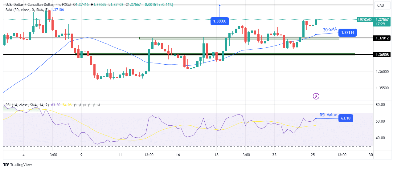 There is anticipation ahead of a Bank of Canada policy decision. US economic data revealed an increase in business output in October. Canadian new home prices fell by 0.2% in September. Wednesday’s USD/CAD forecast shines with optimism as the Canadian dollar continues its collapse against the US dollar. This decline comes amid a growing interest rate advantage for the US dollar, fueled by improved US economic data. Moreover, there is anticipation ahead of a Bank of Canada policy decision. Aaron Hurd from State Street Global Advisors noted, “We are a little bit frozen going into the BoC meeting. However, since July, there has been a consistent weakening trend for the CAD against the US dollar.” Furthermore, he said, “I think the US will maintain that rate advantage for at least the next several quarters over Canada. The US economy is not showing the slowing we’ve seen in the Canadian economy.” On Tuesday, US economic data revealed an increase in business output in October. Manufacturing emerged from a five-month decline, boosting the US dollar against a basket of major currencies. Meanwhile, the spread between Canada’s 2-year yield and its US equivalent widened to 36.8 basis points, the widest gap since April 28. The Canadian yield fell further by 2.3 basis points. Additionally, Canadian new home prices fell by 0.2% in September compared to August and were down 1% annually, according to Statistics Canada. USD/CAD key events today It is a big day for USD/CAD as investors will watch the Bank of Canada policy meeting. Moreover, there will be key reports from the US, including: Building permits. New home sales. Crude oil inventories. A speech from Fed Chair Powell. USD/CAD technical forecast: Bulls secure their position above 1.3701. USD/CAD 4-hour chart The USD/CAD pair has finally made a new high on the 4-hour chart. This move signals a continuation of the bullish trend and strengthens the bullish bias. Moreover, bulls have now found their footing above the 1.3701 key level. The first time the price broke above this level, it struggled to continue higher. Consequently, there was consolidation around the level until the price found support at 30-SMA. At the moment, bulls are making stronger candles above the 1.3701 level. Therefore, the uptrend will likely soon reach the 1.3800 resistance level. https://www.forexcrunch.com/usd-cad-forecast-bulls-picking-up-amid-rate-differential/