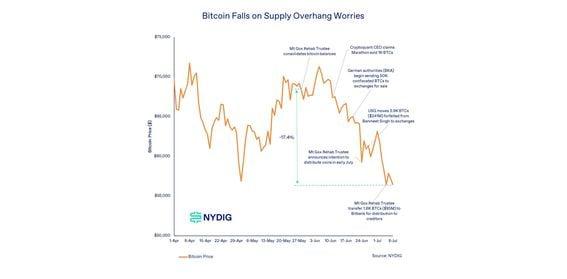 Recent blockchain movements sparked "irrational" fears, offering a buying opportunity for investors, NYDIG's Greg Cipolaro said. Bitcoin (BTC) has plunged 15% over the past month, with many market observers placing the blame on selling pressure from bitcoin mining operators, Mt. Gox refunds and, most recently, the German state of Saxony. The case for the above catalysts as behind the major price decline has been overstated, said Greg Cipolaro, research head at NYDIG, in a Wednesday note. "While emotions and psychology may rule over the short-term, our analysis suggests that the price impact from potential selling may be overblown," he wrote. "We aren’t oblivious to the fact that other factors may be at play here, but it is reasonable to think that the rational investor may find this an interesting opportunity created by irrational fears," he added. Over the past weeks, investors have been fixated on transfers related to Bitcoin addresses linked to the estate of defunct exchange Mt. Gox, the U.S. government and the German state of Saxony, sparking fears about imminent sales of the over $20 billion worth of stash these three entities held combined. Even if all three were selling all their assets – roughly 375,000BTC as of June 9 – at once, Cipolaro found that BTC's price decline over the past weeks was deeper than it would have been for stocks based on Bloomberg's transaction cost analysis (TCA) – a well-followed indicator long used in traditional markets for estimating the price impact of block sales of common stocks. Cipolaro also argued that recent reports about miners capitulating and selling their BTC stash en masse after this year's halving event has not just been overstated, but in some cases wholly inaccurate. NYDIG's data showed that publicly listed mining companies actually increased their bitcoin holdings in June. And while the amount of BTC sold picked up slightly last month, it was still well below levels seen earlier this year and last year. Cipolaro advised against relying on blockchain data about miners moving assets without knowing the nature of those transactions. "Identifying that bitcoins move to an exchange or OTC desk, even if done correctly, only tells us that coins moved. That’s it," he argued. "They could’ve been posted as collateral or lent out, not necessarily sold." https://www.coindesk.com/markets/2024/07/10/bitcoin-price-decline-on-germany-mt-gox-and-miner-sell-pressure-may-be-overblown-nydig/