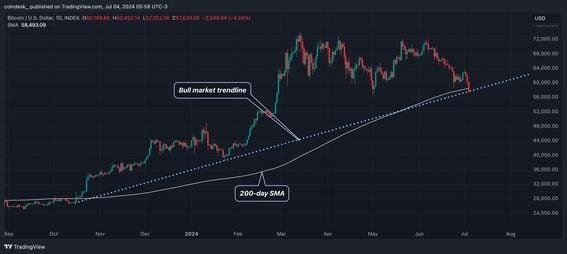 Markets that consistently trade below the 200-day moving average are said to be in a downtrend. BTC fell below the 200-day SMA line for the first time since October. The focus now is on the trendline representing the surge from October lows. Bitcoin's (BTC) decline gathered pace as the largest cryptocurrency fell for a third straight day, dropping below the 200-day simple moving average (SMA), a good indicator of long-term price trends in both traditional and crypto markets. The cryptocurrency slid below the average's $58,492 level during European hours on Thursday to less than $57,300, a price last seen on May 2, according to data on charting platform TradingView. Markets that consistently trade below the 200-day average are said to be in a downtrend, while those trading above the average are considered bullish. BTC rose past the 200-day SMA in October, when the average value was $28,000. The breakout – fueled by expectations for a spot bitcoin ETF in the U.S. – paved the way for a rally to record highs above $70,000 by March. One factor in bitcoin's price movements is the U.S. interest rate. As rates fall, the attraction of riskier investments such as cryptocurrencies increases. The minutes of the Federal Reserve meeting released Wednesday showed policymakers led by Chairman Jerome Powell do not want to cut rates until more data emerges to give them greater confidence that inflation is moving sustainably to their 2% target. That may come as early as tomorrow, when the Labor Department releases its non-farm payrolls figure for June. "We believe hawkish comments from Jerome Powell and the ongoing selling pressure are likely to push BTC down to 52,000," Valentin Fournier, a digital assets analyst at advisory firm brn, said in an email. "However, we recommend viewing this as a buying opportunity, as improving regulations around cryptocurrencies and cooling inflation in the US have not been fully priced in and are likely to bring strong momentum once investors shift focus to a longer-term vision." The sell-off may run out of steam if the payrolls data shows the labor market weakened in June. The figure is forecast to show payrolls increased by 195,000, a notable slowdown from 272,000 a month before, according to FXStreet. The jobless rate is forecast to have held steady at 4.0%, while average hourly earnings are projected to have slowed to 3.9% from 4.1% year-on-year. The bull market progression can be identified by a rising trendline connecting October and January lows. BTC's latest break below the 200-day line has put the focus on the bull market trendline support at $57,590. A close (midnight UTC) below that level could lead to further selling and downward price momentum, as traders often use trendline breakdowns as indicators to make trading decisions. Fournier is not alone in seeing further declines. According to Alex Kuptsikevich, a senior market analyst at FxPro, prices could slide to as low as $51,500 in the short term. "From the current position, a 12% drop to $51.5k (February consolidation area) is more likely than the same amount of growth to $65.8k (50-day MA)," Kuptsikevich said in an email. https://www.coindesk.com/markets/2024/07/04/bitcoin-drops-below-200-day-average-bull-market-trendline-in-focus/