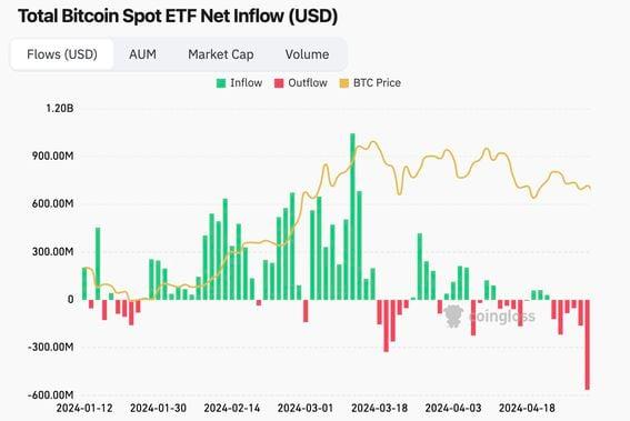 Fidelity's FBTC, not GBTC, led outflows on Wednesday in what may be an alarming development for the bulls. BlackRock's IBIT had its first-ever day of outflows, with $36.9 million exiting the fund. Fidelity's FBTC led outflows, shedding $191 million, followed by GBTC, ARKB and IBIT. Fed Chair Powell ruled out a rate hike as the next move, catalyzing a brief bounce in BTC. Investors dumped U.S.-based spot bitcoin (BTC) exchange-traded funds (ETFs) at the fastest pace ever on Wednesday, even as Federal Reserve (Fed) chairman Jerome Powell dismissed the prospect of a rate hike. The 11 ETFs saw a cumulative net outflow of $563.7 million, the largest since the funds began trading on January 11, extending a five-day losing streak, according to data source Farside Investors and CoinGlass. Investors have pulled out nearly $1.2 billion from the ETFs since April 24. Also notable Wednesday were the first-ever outflows from BlackRock's iShares Bitcoin Trust (IBIT), which saw $36.9 million exiting the fund. Read More: BlackRock Sees Sovereign Wealth Funds, Pensions Coming to Bitcoin ETFs Fidelity’s FBTC led outflows on Wednesday, losing $191.1 million in withdrawals. This might be alarming to bulls as FBTC and BlackRock’s IBIT consistently attracted funds in the first quarter, more than compensating for the regular large outflows from the relatively costly Grayscale ETF (GBTC). On Wednesday, GBTC witnessed the second-largest outflow of $167.4 million, followed by ARKB’s $98.1 million and IBIT's $36.9 million. Other funds also bled money even though Powell's net-dovish approach put a floor under risk assets, including bitcoin. A dovish stance is one where the central bank prefers employment and economic overgrowth over excessive liquidity tightening. The Fed on Wednesday kept the benchmark interest rate unchanged between 5.25% and 5.5% as expected. During the press conference, Powell said the economy is too strong to cut rates while pushing back against fears of renewed rate hikes or liquidity tightening stoked by recent disappointing inflation figures. The Fed also said it will significantly curtail its alternate liquidity tightening program, called quantitative tightening (QT), starting June. Meanwhile, the U.S. Treasury announced a program to buy back billions of dollars in government debts for the first time in over two decades to improve liquidity in the bond market. Like other risk assets, bitcoin is sensitive to expected changes in liquidity conditions and witnessed a brief rally from $56,620 to $59,430 following Powell’s comments. The yield on the 10- and two-year Treasury notes fell along with the dollar index. BTC’s bounce, however, was short-lived, with bitcoin falling back to $57,300 at press time. Early this week, Asia's first spot bitcoin and ether (ETH) ETFs debuted in Hong Kong with disappointing volumes, worsening the mood in the crypto market. CORRECTION (May 2, 12:05 UTC): Adds dropped "million" in second paragraph. https://www.coindesk.com/markets/2024/05/02/us-bitcoin-etfs-bleed-record-563m-even-as-feds-powell-rules-out-rate-hike/