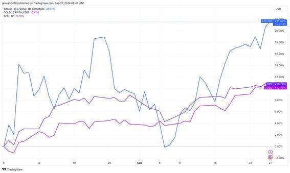 BlackRock's latest report shows that bitcoin has a very low correlation to U.S. equities on a trailing six-month basis. Bitcoin is up 22% since the Yen carry trade unwind on Aug. 5, while gold and the S&P 500 are up around 11%. Over 65% of the circulating bitcoin supply has remained unmoved for over a year. Almost all holders are in profit if they held for three years, while they are all in profit if they held for at least five years - Unchained. BlackRock released a report last week, titled "bitcoin as a unique diversifier." The investment giant identified four key points from the report. First, how to analyze bitcoin (BTC) in relation to traditional financial assets due to its fundamental properties, such as not having a quarterly earnings report or a CEO. Second, bitcoin's high volatility can be perceived as a "risky" asset, which contributes to the discussion that whether it is a "risk-on" or "risk-off" asset. The token could be considered a flight-to-safety option because it is scarce, non-sovereign, and decentralized. Lastly, BlackRock pointed out that the long-term adoption of bitcoin may come from global instability. Bitcoin's realized volatility trends downwards Bitcoin's realized volatility continues to trend downwards over time, indicating increased stability. In the early years of bitcoin, its realized volatility used to trade over 200%; however, as the asset matured, so did the volatility. Since 2018, realized volatility has not exceeded 100% and is currently at 50%. As realized volatility decreases and liquidity increases through financial instruments such as the spot and futures market, this may bring in more sophisticated investors such as options traders. This seems to be on the horizon with the U.S Securities and Exchange Commission's (SEC) approval of physically settled options tied to BlackRock's spot bitcoin ETF. Risk-on or risk-off? BlackRock also asked the question: Is bitcoin risk-on or risk-off? While short-term trading may suggest that bitcoin behaves like a risk-on asset, the data reveals a different narrative over a longer time horizon. According to data from bitcoin custody service Unchained, "almost all holders (99%+) are in profit if they held for just three years. All bitcoin holders in this class are in profit if they held for at least 5 years". We can see this type of mentality on-chain among investors, where over 65% of the circulating bitcoin supply has remained unmoved for more than one year, according to Glassnode. This trend suggests that many investors tend to hold bitcoin because they believe in its store-of-value narrative and view it as a risk-off asset, even though bitcoin has faced multiple 20% corrections in 2024. Low historical correlation with U.S equities BlackRock also showed that bitcoin has a very low correlation to U.S. equities. A graph shows the trailing 6-month S&P 500 correlation with bitcoin; the average correlation is 0.2 since 2015. Sometimes, assets will trade near one-to-one with one another due to external macro factors, most likely in risk-off or liquidity events. The report notes, "These episodes have been short-term in nature and have failed to produce a clear long-term statistically significant correlation relationship." Bitcoin outperforms other risk-on assets after major events Continuing with the theme of having a long-term time preference, BlackRock noted that bitcoin tends to outperform other risk-on assets after 60 days following a major geopolitical event. The U.S.- Iran escalation in 2020 saw bitcoin return 20% after 60 days, outperforming gold and S&P 500. This was also the case for Covid-19, the 2020 U.S. election challenges, the Russian Invasion of Ukraine, the U.S. regional banking crisis, and most recently, the Yen Carry trade unwind on Aug. 5. During the recent Yen carry trade unwind on Aug. 5, which was now 53 days ago, major assets experienced declines on the day. However, bitcoin has risen by 22% since then, with gold and the S&P 500 up roughly 11%. https://www.coindesk.com/markets/2024/09/27/blackrock-highlights-bitcoins-unique-properties-believes-btc-is-risk-off-in-the-long-term/