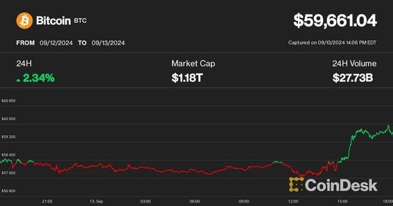 The key variable for risk assets is the U.S. economy as concerns of a recession linger, crypto investment firm Ryze Labs said. Bitcoin, ether (ETH) advanced 2%-3% over the past 24 hours on strong day for cryptos. BTC bottomed last week and should rise further based on daily cycles theory, according to chartist Bob Loukas. The Federal Reserve is expected to lower interest rates next week, but market participants are divided on the size of the cut. Cryptocurrencies rallied on Friday with bitcoin (BTC) nearing the $60,000 level, buoyed by strong gains across the board on traditional markets. Bitcoin tumbled some 1% to $57,600 earlier during the day after software company MicroStrategy announced the purchase of 18,300 BTC for $1.1 billion. The largest crypto quickly recovered the losses and rose sharply later in the session, up 2.2% over the past 24 hours at $59,700. Ethereum's ether (ETH) reclaimed the $2,400 level, up 2.7% during the same period. Crypto analytics firm IntoTheBlock noted that Ethereum's revenues from fees rose nearly 60% in the past week as blockchain activity picked up. The broad-market benchmark CoinDesk 20 Index advanced 2.5%, led by double-digit gains of Polygon's native crypto (MATIC) as Binance added spot and perpetual trading of the recently upgraded POL token. The price action happened as U.S. stocks climbed higher, with the S&P 500 less than 1% away from its July record high a few hours before the market close. Gold continued to break record highs, hitting $2,600 per ounce for the first time ever. A decline in the U.S. dollar against major currencies supported the rally across asset classes. More room to run Bitcoin's rally may have more fuel in the tank based on the asset's daily cycles analysis, well-followed trader and analyst Bob Loukas noted. Cycles theory in technical analysis argues that prices move in waves and have certain periodicity between local peaks and troughs. According to a chart shared on X, bitcoin likely found a local bottom below $53,000 on September 6 and is only on its 7th day in a fresh cycle. The previous daily cycle lasted over sixty days and topped on the 24th day, leaving plenty of time for BTC to make news highs before rolling over. "These cycles have time left should remain strong into FOMC," Loukas said. Next week's key event to watch will be Wednesday's Federal Open Market Committee (FOMC) meeting, which will most certainly mark the Federal Reserve's first interest rate cut since 2020. Observers are still divided about the size of the cut, with probabilities almost evenly split between a 25 basis point and a larger, 50 bps cut, according to CME FedWatch Tool. Despite the prospect of looser monetary policy, which would in theory be beneficial to risk assets, lingering concerns of a forthcoming recession weigh on the market, crypto investment firm Ryze Labs said in a Friday report. "The key variable here is the state of the U.S. economy," the report said. "If it remains resilient and avoids a recession, risk assets are likely to continue their upward trajectory. If not, then we’re in for a bumpy ride," the report added. https://www.coindesk.com/markets/2024/09/13/bitcoin-eyes-60k-and-likely-have-more-room-to-rally-analyst-says/
