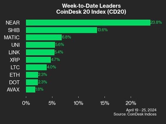 The majority of the assets posted gains despite a choppy market, but there were notable decliners as well. CoinDesk Indices (CDI) presents its bi-weekly market update, highlighting the performance of leaders and laggards in the benchmark CoinDesk 20 Index (CD20) and the broad CoinDesk Market Index (CMI). The majority of assets within the Index closed Thursday higher than they did a week earlier despite choppy price action. Just five tokens closed lower. Overall, the CoinDesk 20 gained 2.1% on the week. Near Protocol (NEAR) continued to outperform the rest of the CoinDesk 20 with a 24% advance. The protocol has recently been making moves in the decentralized AI space, which has coincided with an outsized move higher over the past few weeks. Aptos ((APT)) was among the undeperformers, losing 5.1% of its value last week. Filecoin ((FIL) and bitcoin cash ((BCH) were the only other assets to see meaningful moves lower. CoinDesk 20 tracks top digital assets and is investible on multiple platforms. The broader CMI comprises approximately 180 tokens and seven crypto sectors: currency, smart contract platforms, DeFi, culture & entertainment, computing, and digitization. https://www.coindesk.com/markets/2024/04/26/near-and-shib-led-coindesk-20-gainers-last-week-coindesk-indices-market-update/