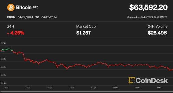 The latest price moves in crypto markets in context for April 25, 2024. Latest Prices Top Stories Bitcoin, the world’s largest cryptocurrency by market value, has dropped 4% over the last 24 hours to less than $64,000. Ether also saw a significant downside, losing 6%, and the CoinDesk 20 Index, a measure of the broader crypto market, lost 6% as well. Reuters reported that U.S. issuers expect the Securities and Exchange Commission to deny their applications to launch spot ether exchange-traded funds (ETFs) after discouraging meetings with the agency in recent weeks. In traditional markets, tech stocks declined after Meta failed to live up to high expectations for its first-quarter earnings report. BlackRock’s spot bitcoin exchange-traded fund (ETF), which trades under the ticker IBIT on Nasdaq, fell out of favor on Wednesday, preliminary data published by Farside Investors showed. For the first time since going live on Jan. 11, the fund did not draw any investor money, snapping a 71-day inflows streak. Seven of the other 10 funds followed IBIT’s lead. Fidelity’s FBTC and the ARK 21Shares Bitcoin ETF (ARKB) registered inflows of $5.6 million and $4.2 million, respectively, while Grayscale’s GBTC bled $130.4 million, leading to a net cumulative outflow of $120.6 million, the highest since April 17. U.S. House Representative Maxine Waters (D-California) indicated that the final version of a stablecoin bill could be ready soon. "We are on our way to getting a stablecoin bill in the short run,” the top Democrat on the House Financial Services Committee told Bloomberg on Wednesday. Waters has previously called a version of the stablecoin bill “deeply problematic and bad for America." “It’s about making sure investors and that the people are protected,” Waters told Bloomberg. “We have to ensure that they have those assets to back up stablecoins,” she said. The latest development strengthens hopes that the U.S. can get a new stablecoin law before the elections this year, which was considered a longshot at the start of the year. Chart of the Day The chart shows CryptoQuant's Coinbase premium index, which tracks the spread between bitcoin’s prices on the Nasdaq-listed Coinbase (COIN) exchange and the offshore giant Binance. The indicator shows bitcoin is again trading at a discount on Coinbase, reflecting a weaker net buying pressure from U.S. investors. Source: CryptoQuant. Trending Posts EigenLayer-Powered Aligned Layer Raises $20M to Make ZK Proofs Faster, Cheaper on Ethereum 'Buy Bitcoin' Sign Sold for Over $1M at Auction Spot Bitcoin, Ether ETFs Get Official Approval in Hong Kong; 'Potential Fee War' Unfolding, Says Analyst https://www.coindesk.com/markets/2024/04/25/first-mover-americas-bitcoin-drops-below-64k-ether-falls/