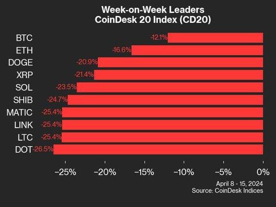 Five cryptos lost more than 30% this week, led by steep declines in Uniswap and Aptos. CoinDesk Indices (CDI) presents its bi-weekly market update, highlighting the performance of leaders and laggards in the benchmark CoinDesk 20 Index (CD20) and the broad CoinDesk Market Index (CMI). All 20 assets in the CoinDesk 20 lost ground over the past week, but Bitcoin (BTC) and ether (ETH) outperformed peers, losing 12.1% and 16.6%, respectively, for the seven days ending on Monday. Uniswap (UNI), filecoin (FIL) and Aptos (APT) bore the brunt of the selloff with losses of more than 35%. Overall, five cryptos fell more than 30% over the last week. Within the broader CMI universe, which contains 187 tradable digital assets, only three tokens outperformed bitcoin over the week. Real-world assets (RWA) platform Ondo Finance's governance token (ONDO) was the only coin with positive returns. CoinDesk 20 tracks top digital assets and is investible on multiple platforms. The broader CMI comprises approximately 180 tokens and seven crypto sectors: currency, smart contract platforms, DeFi, culture & entertainment, computing, and digitization. https://www.coindesk.com/markets/2024/04/16/bitcoin-and-ethereum-show-relative-resilience-amid-widespread-losses-coindesk-indices-market-update/