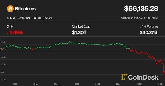 Looking beyond today's decline, investors may expect continued market weakness due to the tax season, Ryze Labs said in a report. Cryptocurrencies tumbled Friday as risk-off sentiment in traditional markets amid flared-up geopolitical risks spread over to digital assets. In fast downward afternoon action during U.S. trading, bitcoin (BTC) plunged below $66,000 after having challenged the $71,000 level just hours earlier. At press time, bitcoin had bounced back to $66,700, down more than 5% over the past 24 hours. Ether (ETH), the second-largest cryptocurrency by market cap, fell as much as 12% to $3,100 before a modest bounce cut the decline to 8%. Smaller cryptos suffered even heavier losses in the panicky action. The broad-market CoinDesk 20 Index (CD20) dropped nearly 10%, with Cardano's ADA, Avalanche's AVAX, bitcoin cash (BCH), filecoin (FIL) and aptos (APT) plummeting 15-20%. The drawdown triggered the largest leverage washout in a month, liquidating some $850 million of leveraged derivatives trading positions across all digital assets, CoinGlass data shows. Some $770 million of those positions were longs betting on rising prices, caught off-guard by the sudden decline. The dip occurred as stock markets sank during the U.S trading session amid rising fears of broadening conflict in the Middle East, as U.S. authorities warned that Iran could prepare to launch a significant attack on Israel. Treasury bonds and the U.S. dollar index (DXY) surged as traders flocked to hedges, while key U.S. equity indices the S&P500 and Nasdaq 100 slipped 1.7% an hour ahead of the close of the trading session. Gold, long considered as a haven asset, surged past $2,400 to a new all-time high before paring its gains, while oil ticked 1% higher. Digital asset investment firm Ryze Labs, formerly Sino Global Capital, said in a Friday commentary to anticipate some "short-term market softness" for crypto assets due to the upcoming tax season. However, it maintained a more constructive long-term outlook, expecting relief for the asset class as policymakers will slow quantitative tightening and potentially adjust monetary policy to facilitate U.S. government debt rollovers. https://www.coindesk.com/markets/2024/04/12/bitcoin-plunges-to-66k-altcoins-tumble-10-15-on-ugly-day-for-risk-assets/
