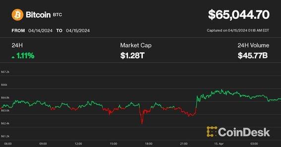 The market has shaken off concerns of escalations between Iran and Israel as the U.S. appears to have talked Israel out of a counter-attack. BTC is back above $65,000 as geopolitical volatility subsides. Traders are also anticipating the approval of BTC ETFs in Hong Kong, which is expected later Monday or this week. Bitcoin (BTC) is trading above $65,000, while ether (ETH) is back above $3100 as market volatility has calmed after Iran launched a massive drone and missile attack against Israel that was mostly thwarted by air defense systems. Bitcoin dropped below $62,000 over the weekend as geopolitical tension shook the markets. However, tension seems to have subsided, and this conflict will not escalate further as the U.S. has ruled out joining an Israeli counter-attack on Iran, according to Al-Jazeera. Traders on Polymarket give a 4% chance of Israeli military action against Iran by April 15. This is down from nearly 57% in the immediate hours after Iran’s missile attack. At the height of the tensions, PAXG, a tokenized gold digital asset created by Paxos, was trading at a 20% premium over its analog counterpart as crypto traders fled risk assets for the safety of the yellow metal. Before the tension kicked off, the digital asset market had already been under immense selling pressure because of U.S. tax season, which also occurs in the run-up to the halving. “Given that the halving occurs at a time when dollar liquidity is tighter than usual, it will add propellant to a raging firesale of crypto assets,” Arthur Hayes wrote in a blog post on the topic. Traders are also anticipating the launch of bitcoin and perhaps ether ETFs in Hong Kong this week, giving traders in China easier access to digital assets exposure. Matrixport estimates that these ETFs could unlock up to $25 billion in demand. https://www.coindesk.com/markets/2024/04/15/bitcoin-back-in-green-as-crypto-market-awaits-hong-kong-spot-etf-decision/
