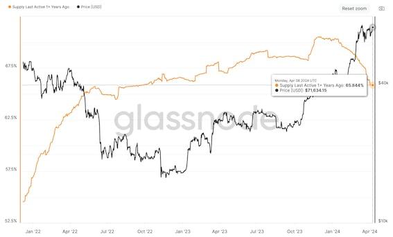 The decline likely represents profit-taking by investors who held coins for one year and over and marks a shift from the holding strategy seen through 2023. The percentage of bitcoin's circulating supply last active at least a year ago has declined from 70% to 65.8% in three months. The decline probably indicates profit-taking by some investors in a rising market. The percentage of bitcoin's circulating supply that last moved on-chain at least a year ago has declined to the lowest since October 2022, according to data tracked by blockchain analytics firm Glassnode. On Monday, 12.95 million BTC, equating to 65.84% of the circulating supply of 19.67 million BTC, remained unchanged for over a year, the lowest percentage since October 2022. The metric peaked above 70% with the debut of nearly a dozen spot exchange-traded funds (ETFs) in the U.S. in mid-January and has been falling ever since. Since late December, the percentage of the circulating supply that has not moved in at least two years has declined to 54.% from 57.4%. The decline likely represents profit-taking by investors who held coins for one year and over and marks a shift from the holding strategy seen through 2023. The urge to sell likely stems from bitcoin's massive 148% price surge since April last year and the 50% rally since the ETFs began trading in the U.S. At press time, bitcoin changed hands at $70,400. However, it's difficult to ascertain the exact percentage of bitcoin that left the inactive supply has been liquidated in the market. According to the data tracking website MacroMicro, a decrease in the percentage of inactive BTC is a "leading indicator for the end of the bull run." Past data, however, show that bull markets tend to peak as the percentage of inactive supply bottoms out and begin rising. https://www.coindesk.com/markets/2024/04/09/bitcoin-supply-inactive-for-a-year-slides-to-18-month-low-of-658/