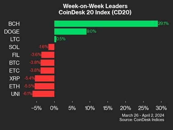 All but three cryptos in the index posted losses last week, with alternative L1s NEAR, APT, and AVAX declining the most. CoinDesk Indices (CDI) presents its bi-weekly market update, highlighting the performance of leaders and laggards in the benchmark CoinDesk 20 Index (CD20) and the broad CoinDesk Market Index (CMI). Only three assets in the CoinDesk 20 closed higher compared to one week ago: bitcoin cash (BCH) up 29%, dogecoin (DOGE) up 9% and litecoin (LTC) up 0.5%. Bitcoin cash has gained more than 4x year-over-year, but still maintains a market cap that is less than 1% of that of bitcoin (BTC). Six assets in the CoinDesk 20 weakened more than 10% this past week, led by Layer 1s (NEAR), (APT) and (AVAX). The CoinDesk 20 Index fell 4.3% over the week, with 17 assets declining. Bitcoin and ether (ETH) contributed to this downturn, dropping 3.8% and 5.5%, respectively. CoinDesk 20 tracks top digital assets and is investible on multiple platforms. The broader CMI comprises approximately 180 tokens and seven crypto sectors: currency, smart contract platforms, DeFi, culture & entertainment, computing, and digitization. https://www.coindesk.com/markets/2024/04/02/bitcoin-cashs-29-advance-led-coindesk-20-gainers-last-week-coindesk-indices-market-update/