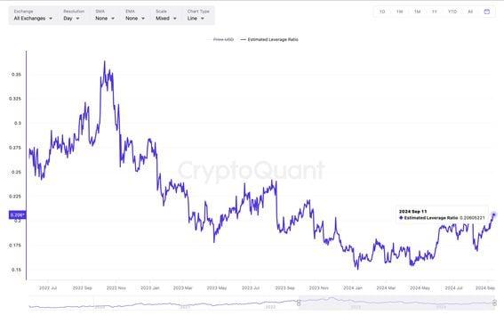 High-leverage liquidity in bitcoin is concentrated at around $58,500, according to Hyblock Capital. Renewed bias for leverage points to increased investor risk appetite. High-leverage liquidity in bitcoin is concentrated at around $58,500. Increased leverage indicates traders taking on more risk and a possible jump in price volatility. Leverage in the bitcoin (BTC) market is growing again, a sign traders are looking to take on more risk, potentially injecting volatility into the market. The so-called estimated leverage ratio, which divides global futures open interest by the number of coins held on exchanges, has jumped to 0.2060, the highest since October 2023, according to data tracked by analytics firm CryptoQuant. The increase follows a months-long consolidation below 0.20, pointing to traders increasingly using borrowed funds to amplify their futures positions and a risk-on environment. A low ratio suggests a cautious approach. The estimated leverage ratio peaked following the collapse of Sam Bankman Fried's FTX exchange, formerly the third-largest futures trading platform in late 2022 and trended lower till December 2023. Leverage allows traders to control larger positions with relatively little capital, magnifying both profits and losses. It's a double-edged sword that exposes traders to margin shortages and forced liquidations when the market moves against their positions, which, in turn, adds to price volatility. "The recent increase in the Bitcoin Estimated Leverage Ratio suggests a growing trend among investors toward higher leverage in the derivatives market," CryptoQuant said in a blog post. $58,500 is the key level According to Hyblock Capital, high-leverage liquidity is stacked at around $58,500. So, once prices approach that level, volatility could pick up, especially because overall market liquidity remains low. That means a buy/sell order can have an outsized impact on the going market rate. "High-leverage liquidity zones around $58,500 could drive increased volatility and create opportunities for traders as Bitcoin gravitates toward these levels," Hyblock said in an email to CoinDesk. "Combined order book liquidity remains low, suggesting bullish potential, while the global bid-ask ratio remains positive, indicating robust underlying demand," Hyblock added. At press time, bitcoin changed hands at around $58,000, representing a 2.5% over 24 hours, according to CoinDesk data. Ether (ETH), the second largest cryptocurrency by market value, traded 1% higher at $2,350, with an estimated leverage ratio of 0.35. https://www.coindesk.com/markets/2024/09/12/leverage-in-the-bitcoin-market-is-increasing-again/