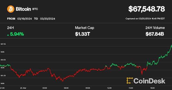 Fed policymakers maintained their outlook for three rate cuts by the end of the year, alleviating market concern of a more hawkish stance. Bitcoin topped $67,000, a more than 10% jump from lows hit hours earlier, after the Fed's decision on rates and comments about interest rates. Ether rebounded from a drop prompted by fears of more SEC regulation, while dogecoin soared on Coinbase's plan to list futures contracts. Crypto markets bounced sharply higher and bitcoin (BTC) targeting $67,000 on Wednesday as U.S. Federal Reserve Chair Jerome Powell hit a dovish tone after and the central bank maintained its outlook for three rate cuts this year despite hotter-than-expected inflation figures. Bitcoin (BTC) hit a $67,781 daily high, recording a more than 10% recovery from level seen hours earlier. Ether (ETH) erased its 6% dip earlier in the day that had been triggered by news reports about the Ethereum Foundation facing a confidential inquiry from an unnamed government and the U.S. Securities and Exchange Commission considering classifying the asset as a security. Dogecoin (DOGE), litecoin (LTC) and bitcoin cash (BCH) led gains among major cryptocurrencies as people finally noticed a Coinbase plan, posted on a U.S. regulator's website several weeks ago, to offer futures contracts on them. The broad-market CoinDesk 20 Index (CD20) was up nearly 3% over the past 24 hours. Traditional markets also climbed higher. The S&P 500 index jumped nearly 1% to a fresh all-time high, while the tech-heavy Nasdaq-100 gained 1.3%. The U.S. dollar index (DXY), which measures the strength of the dollar against other major currencies, declined nearly 0.7% from its session high, signaling a greater risk appetite among investors. Digital asset prices suffered a steep correction over the past week, with BTC enduring its largest daily loss since the collapse of FTX in November 2022, as market participants turned risk-averse ahead of the Fed's Wednesday decision, fearing that last month's stickier inflation reports could deter the Fed rate cut plans. Wednesday's Federal Open Market Committee (FOMC) concluded with policymakers keeping interest rates and rate cut plans steady, removing the risk of a more hawkish scenario that had weighed on asset prices. Powell said during a press conference that "we are making good progress on bringing inflation down," despite the higher inflation readings. "Fed expects slightly higher inflation but not enough to derail their dovish inclination," Fejau, an analyst at market analytics firm Reflexivity Research, said in an X post. "Up only." https://www.coindesk.com/markets/2024/03/20/bitcoin-targets-67k-on-dovish-fed-remarks-ether-rebounds-from-sec-fears/